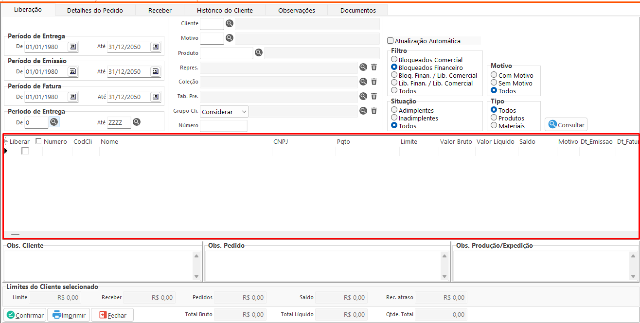 Está aba é utilizada para consulta dos pedidos e possibilita a liberação do mesmo.