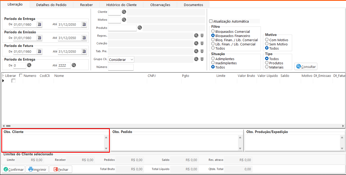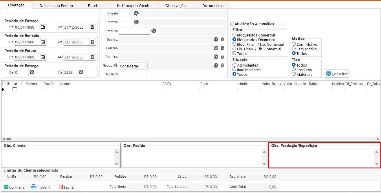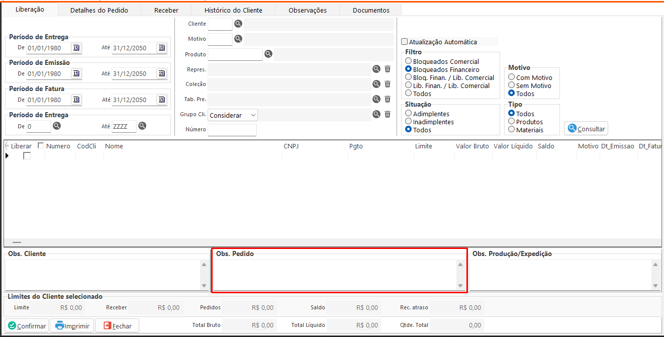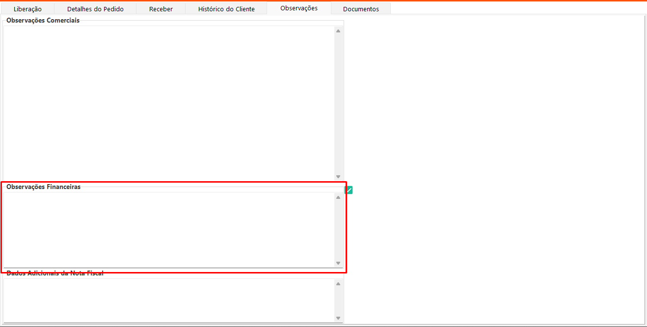 • Observações Financeiras: Exibe e permite editar a observação financeira cadastrada no cliente referente ao pedido selecionado na aba Liberação.