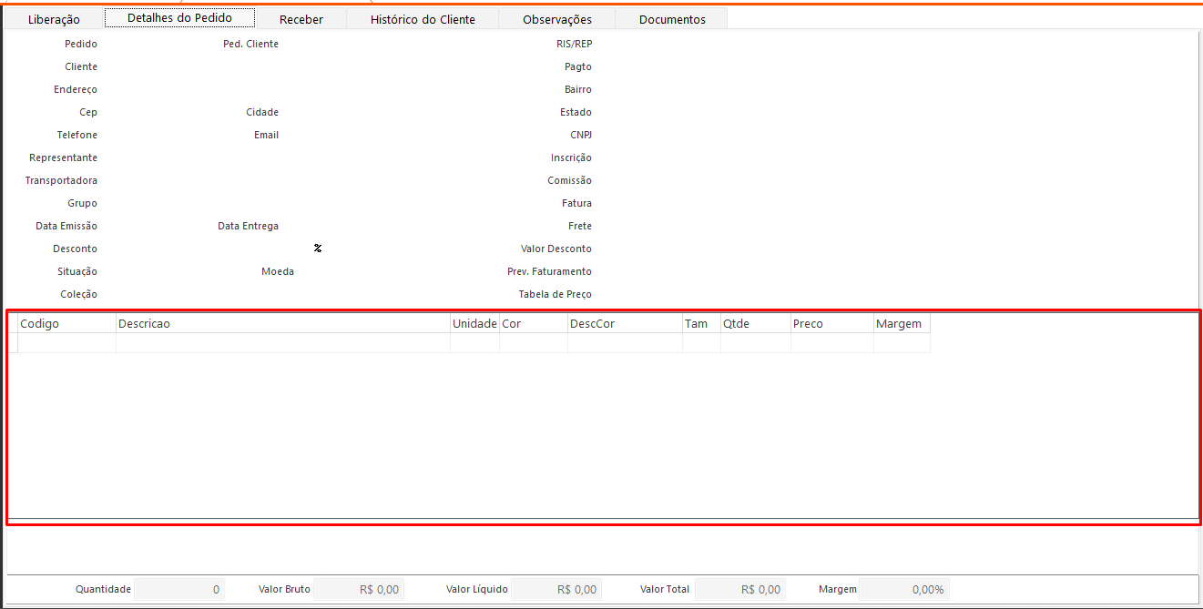 • Itens do Pedido: Exibe os itens detalhados do pedido selecionado na tabela Pedido da aba Liberação.