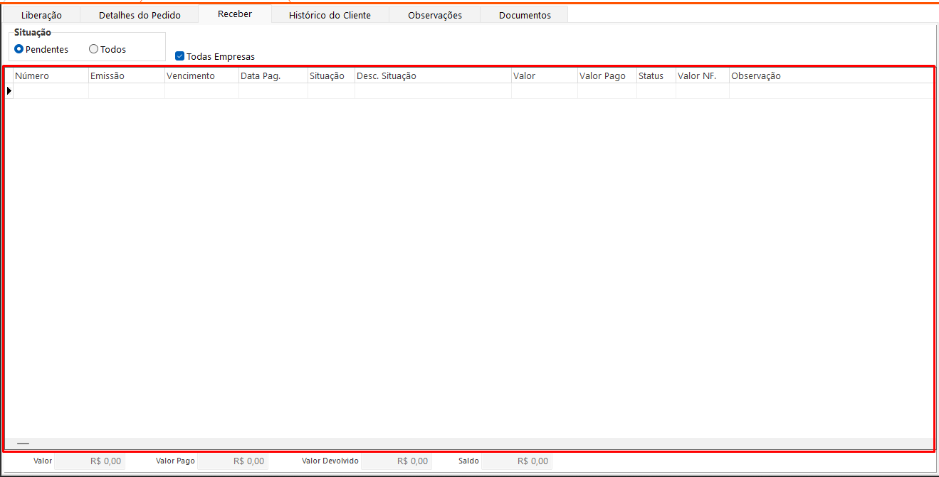 Nesta aba, é possível visualizar os títulos do cliente relacionado ao pedido selecionado na aba Liberação.