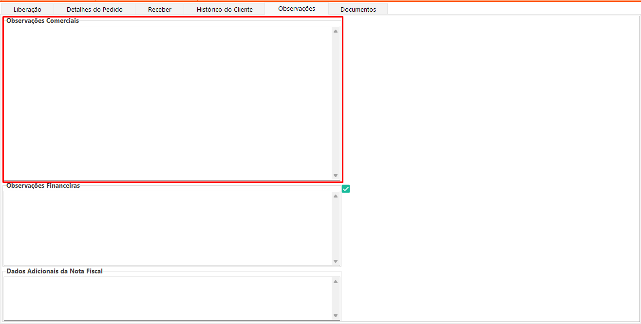 • Observações Comerciais: Exibe a observação cadastrada no cliente referente ao pedido selecionado na aba Liberação.