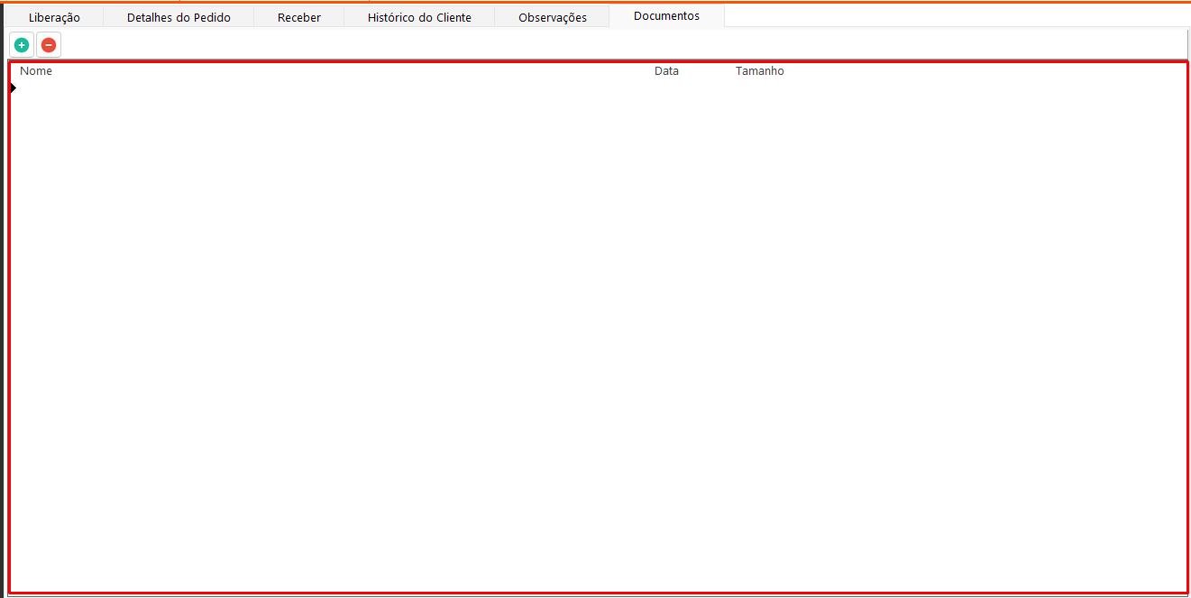Nesta aba é possível visualizar, adicionar e excluir documentos relacionados à entidade do pedido selecionado na aba Liberação.
