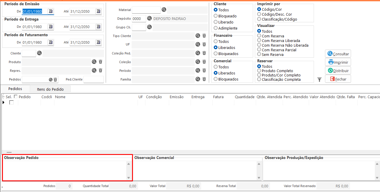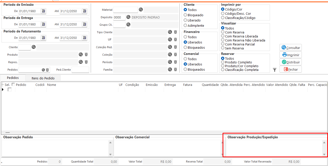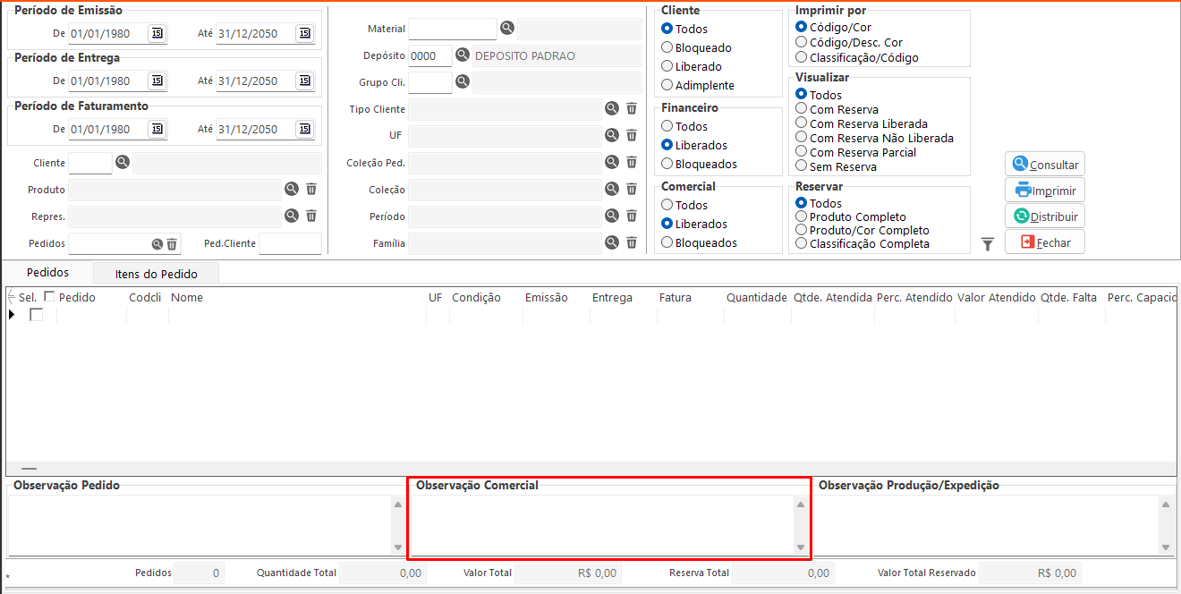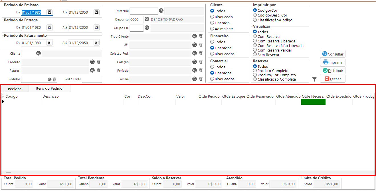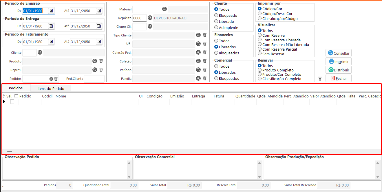 • Consultar: Executa a consulta com base nos filtros definidos na tela e distribui o estoque para verificar quais pedidos podem ser atendidos.