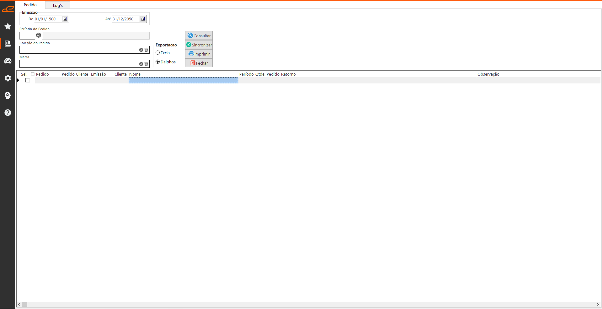 A tela “Exportação de Pedidos” permite exportar os pedidos do ERP para o Delphos e sincronizar as informações entre ambos.
