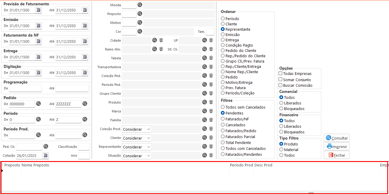 - Previsão de Faturamento: Define a data inicial e final da previsão de faturamento do pedido na consulta.