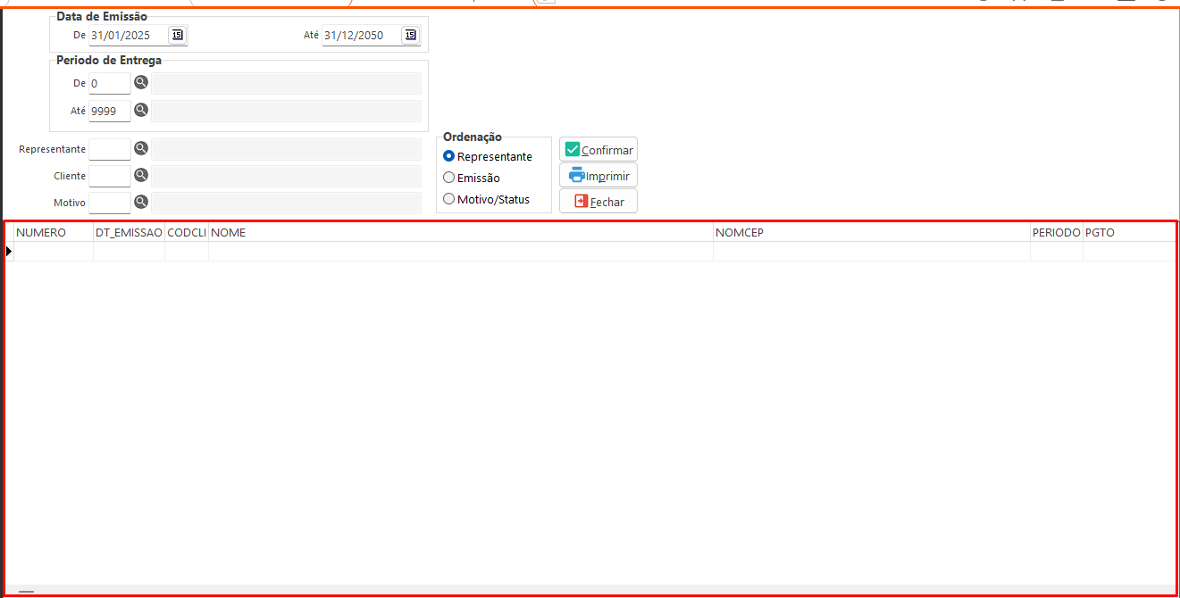A tela “Pedidos por Representante” é um relatório que exibe de forma resumida as informações do pedido e do representante. Este relatório se destaca pela possibilidade de consulta por representante, apresentando dados mais concisos sobre o pedido.
