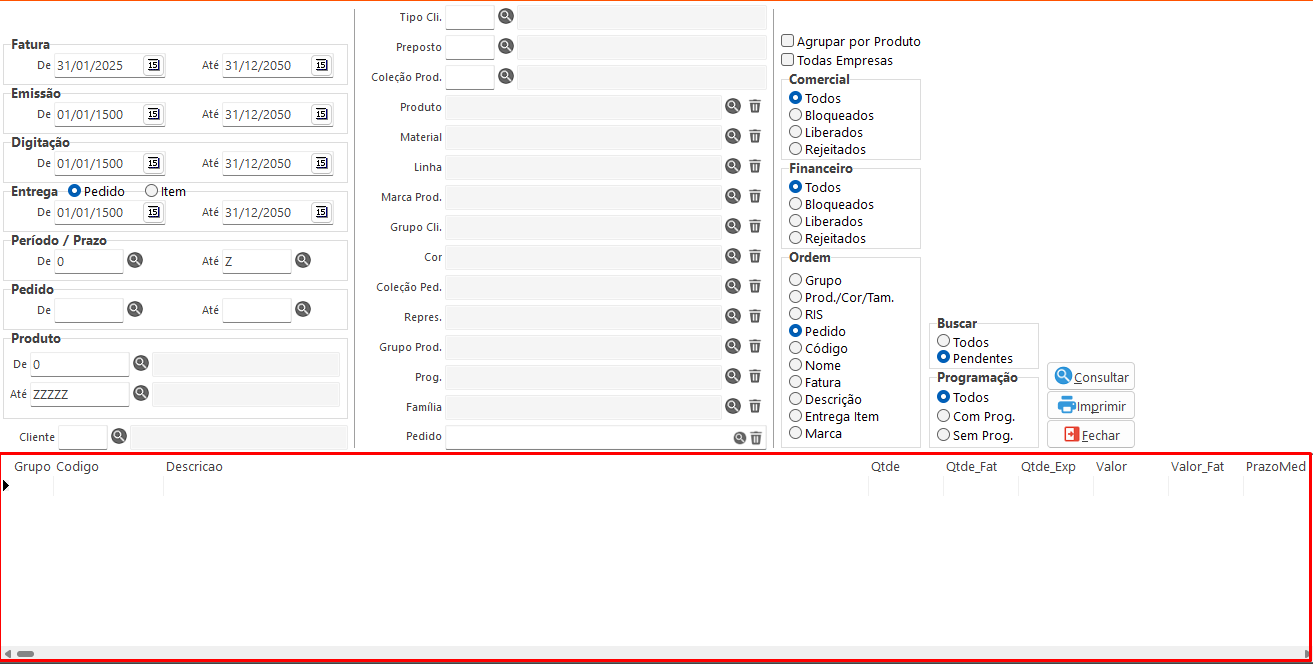• Buscar: Define se a consulta considerará apenas pedidos com quantidade em aberto ou um total geral.