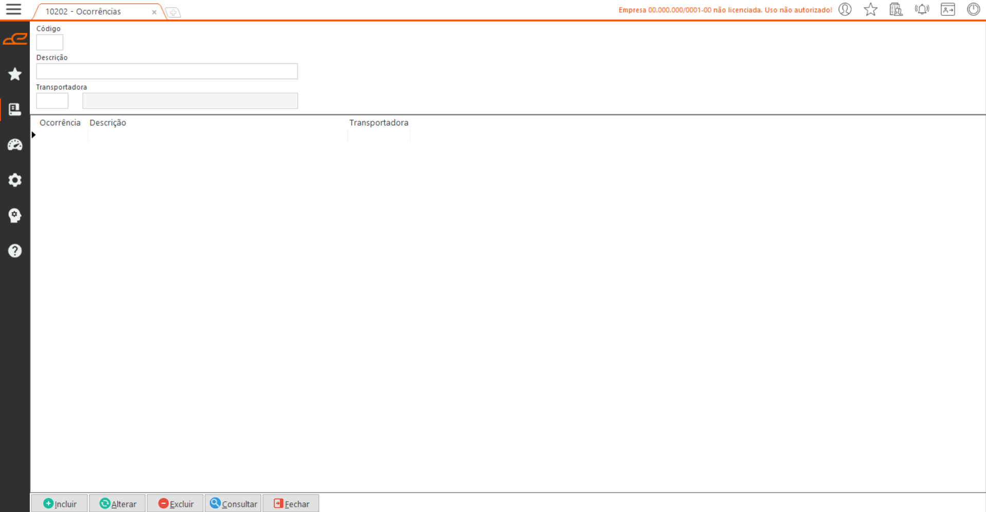 A tela “Ocorrências” permite o cadastro dos códigos de ocorrência utilizados pelas transportadoras. Essas informações são essenciais para os processos de integração de frete, como rastreamento de entregas e entrada de conhecimentos de frete.