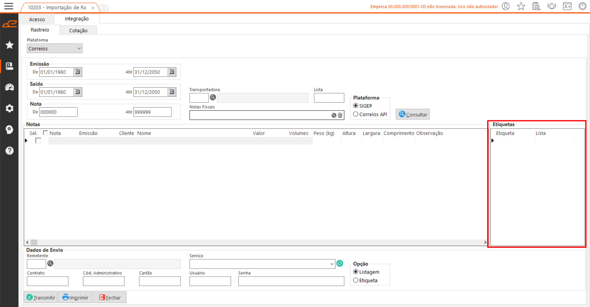 - Transmitir: Envia as informações das etiquetas para a plataforma selecionada, possibilitando a impressão após a transmissão.