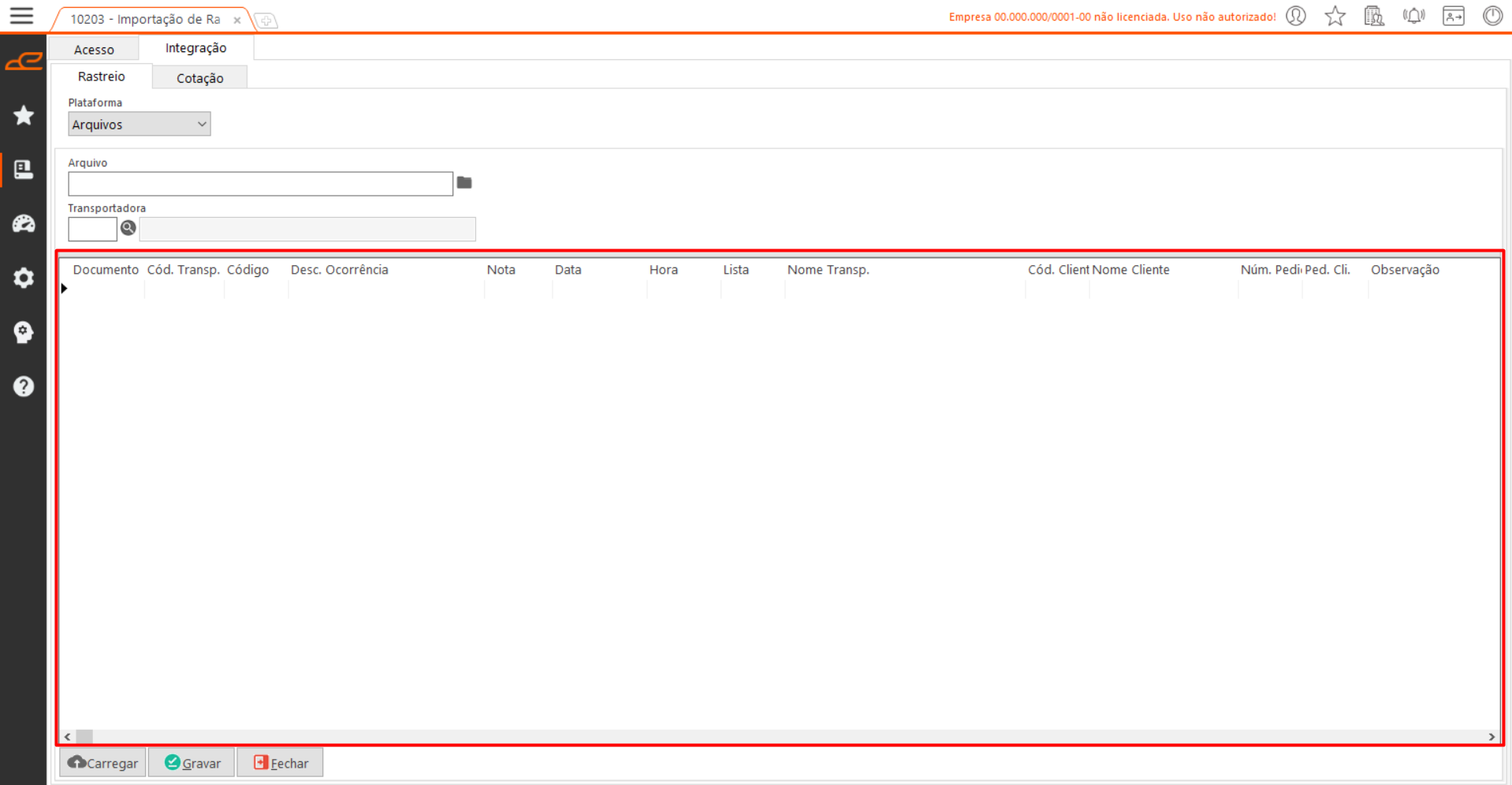 - Na integração de Arquivos, é possível importar arquivos de rastreamento fornecidos pelas transportadoras. Os arquivos suportados nessa rotina são do tipo .txt.