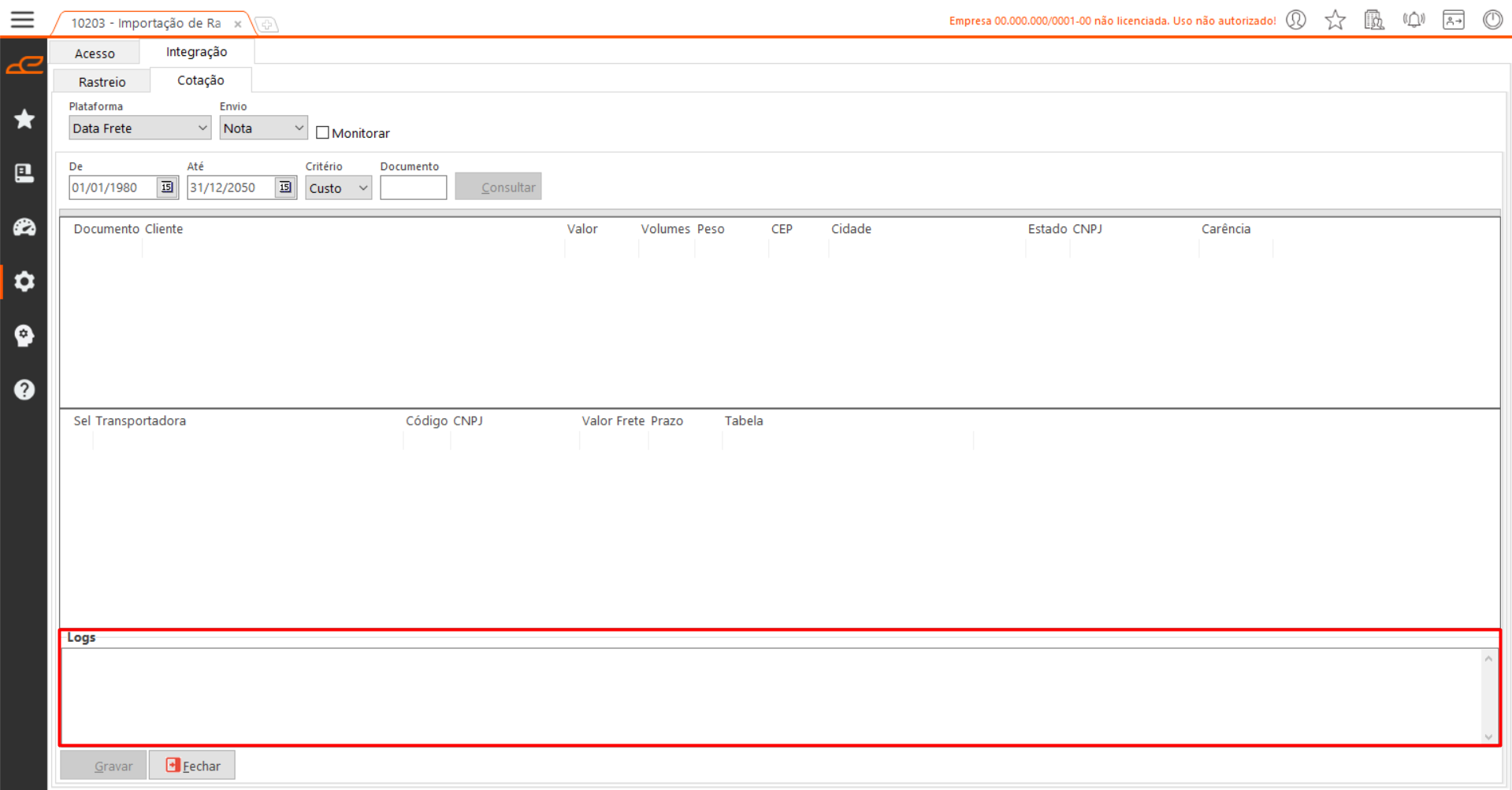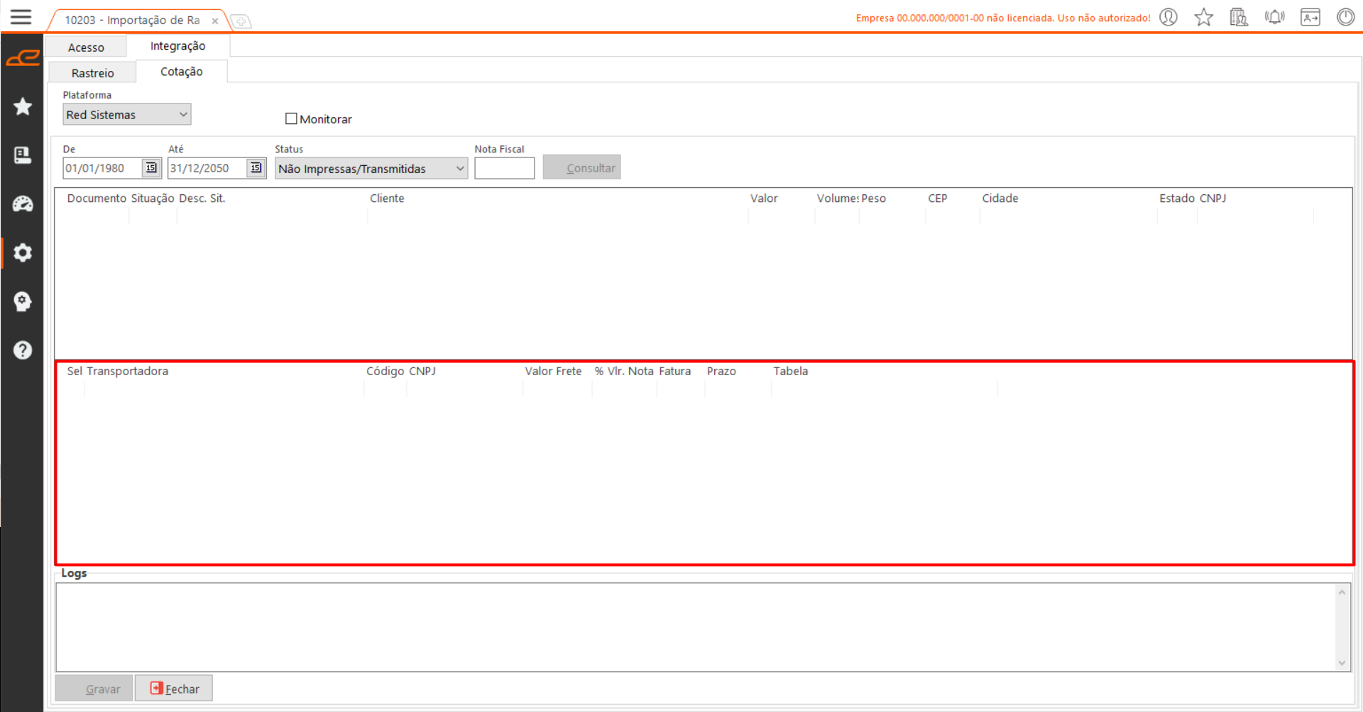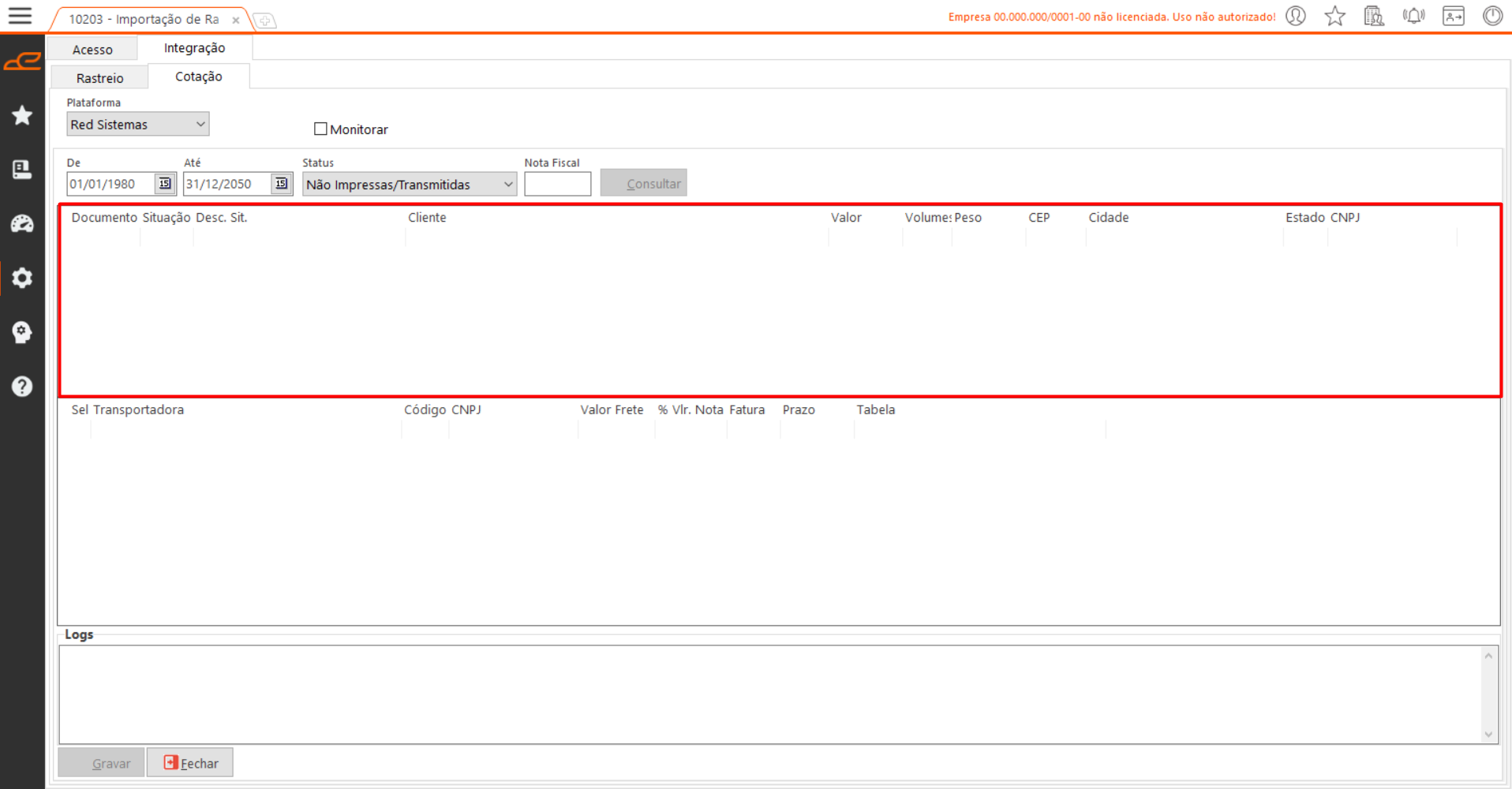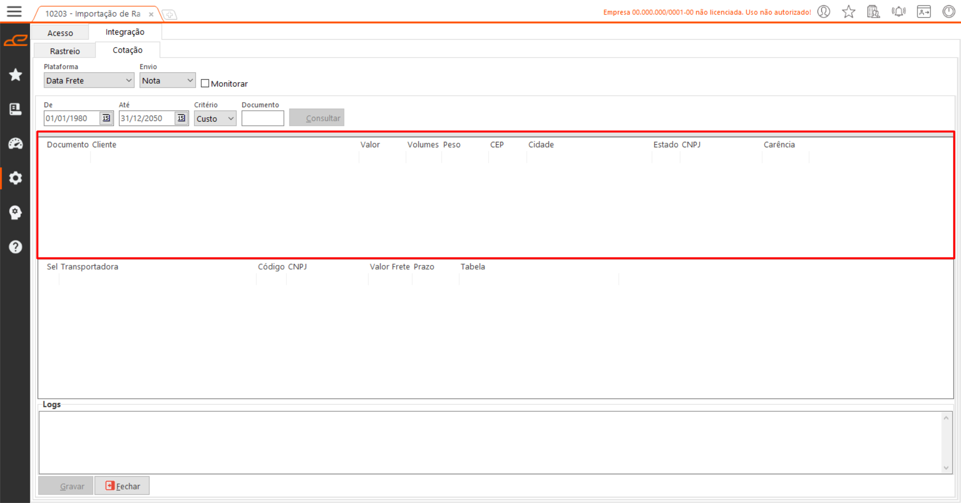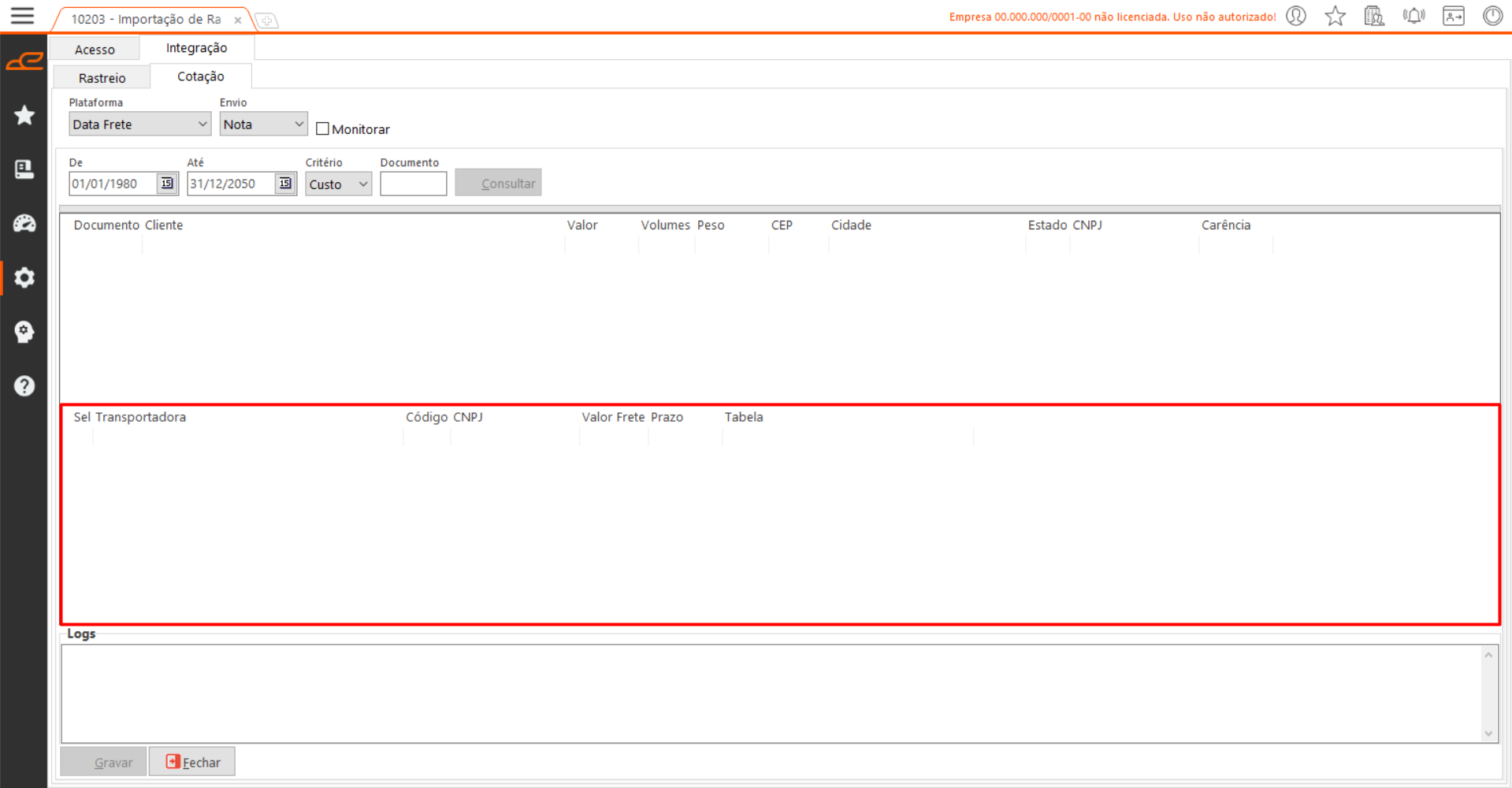 - Consultar: Realiza a busca de notas fiscais ou pedidos vinculados à transportadora configurada, cujas notas ainda não foram impressas e cuja modalidade de frete seja CIF. O sistema gera um JSON para cada fatura e consulta os valores de frete na plataforma. Com base no retorno, o grid é preenchido com as cotações obtidas das transportadoras.