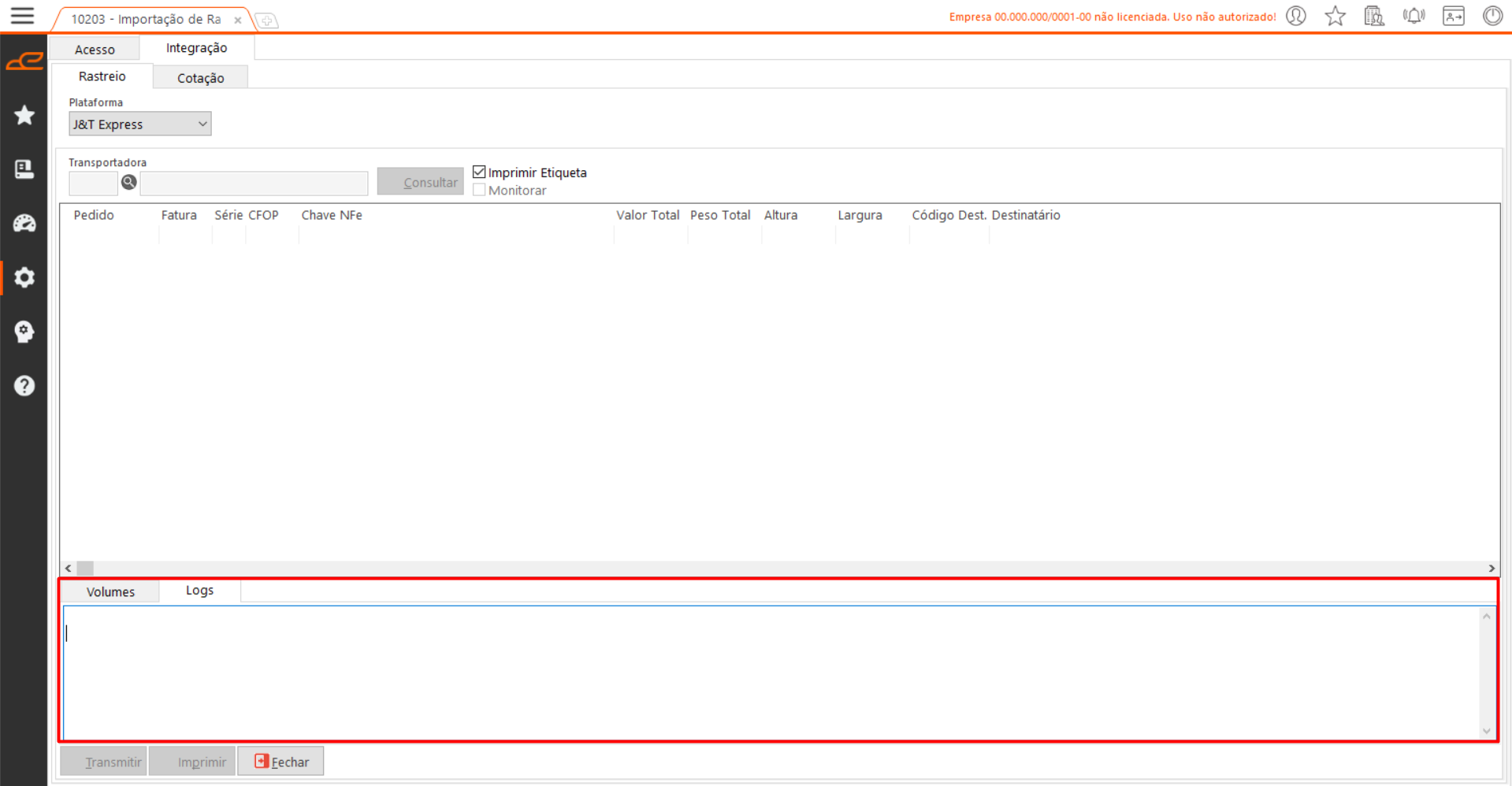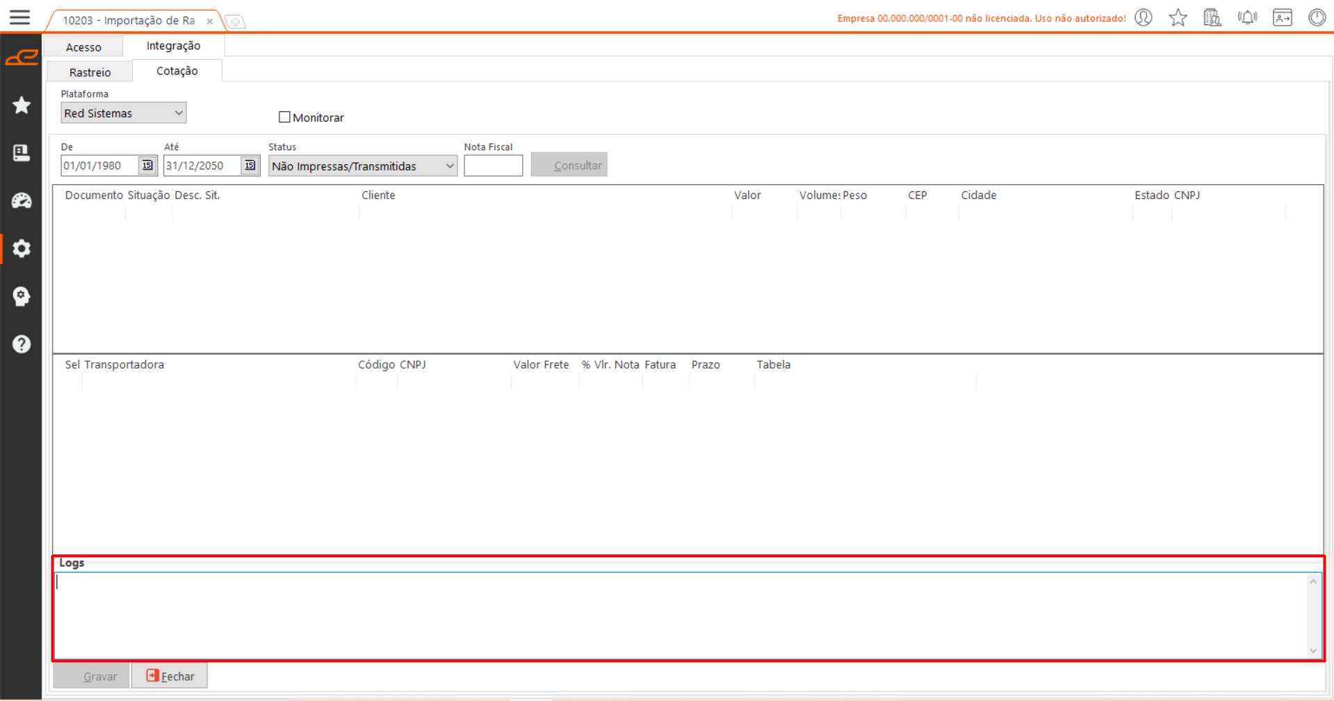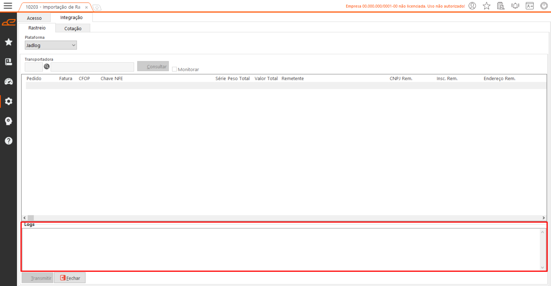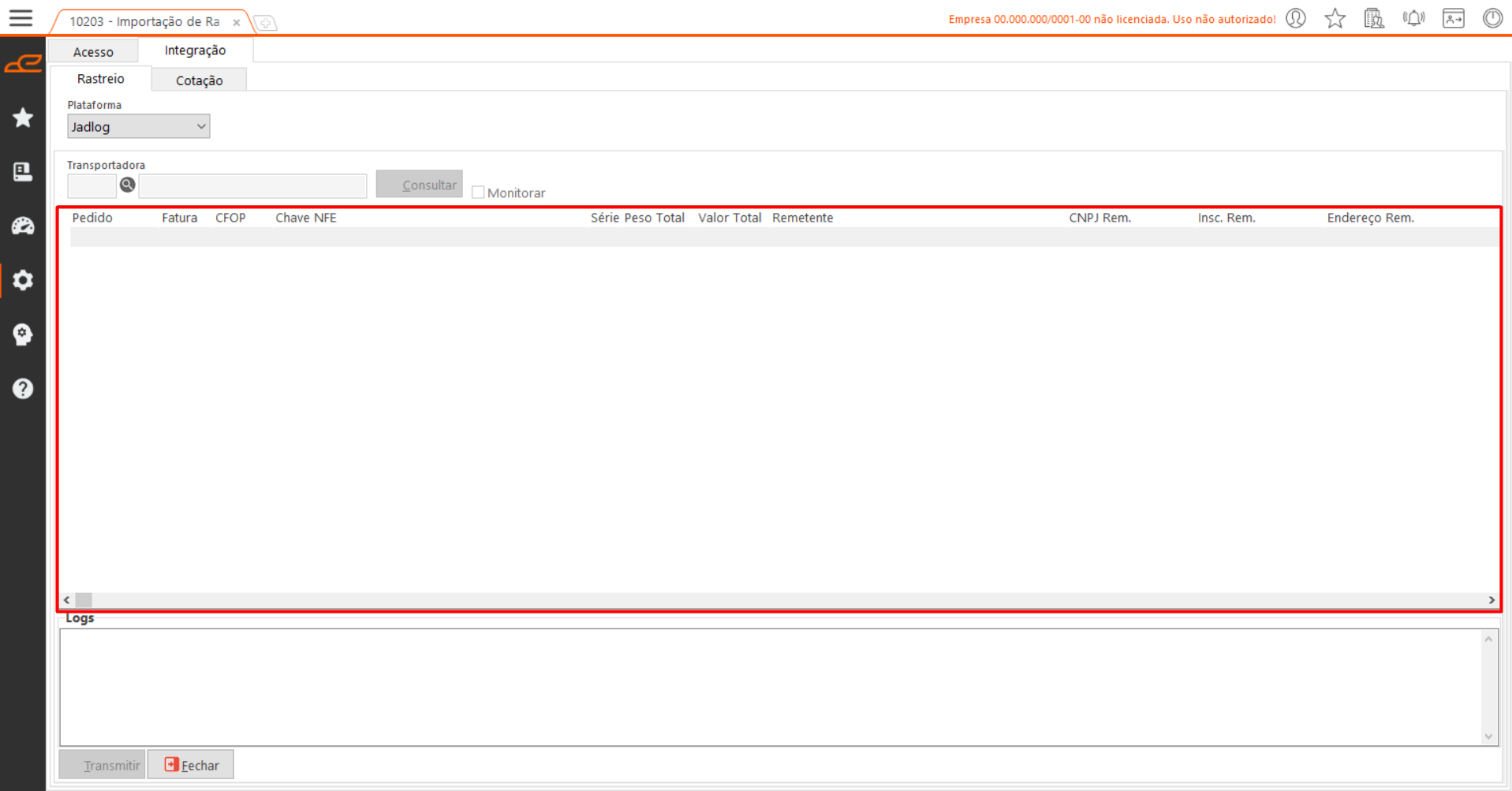 - Logs: Registra as atualizações da integração relacionadas ao transporte.