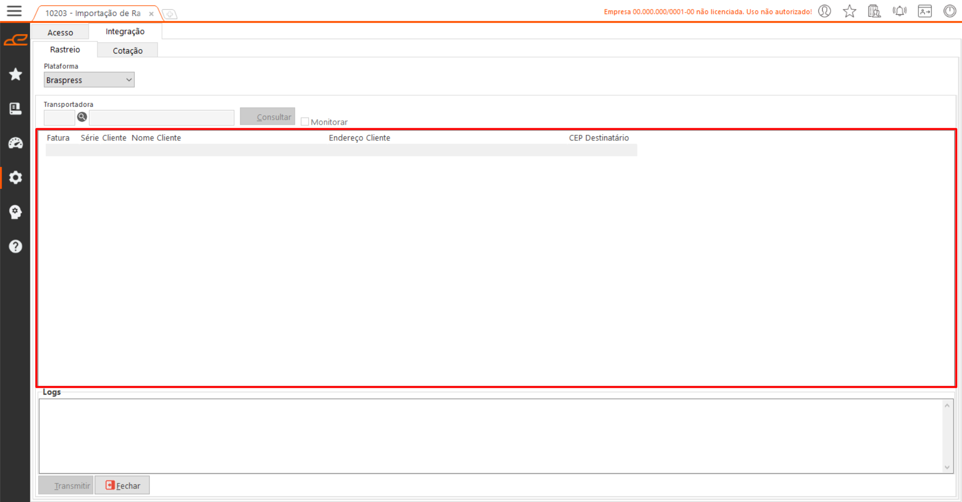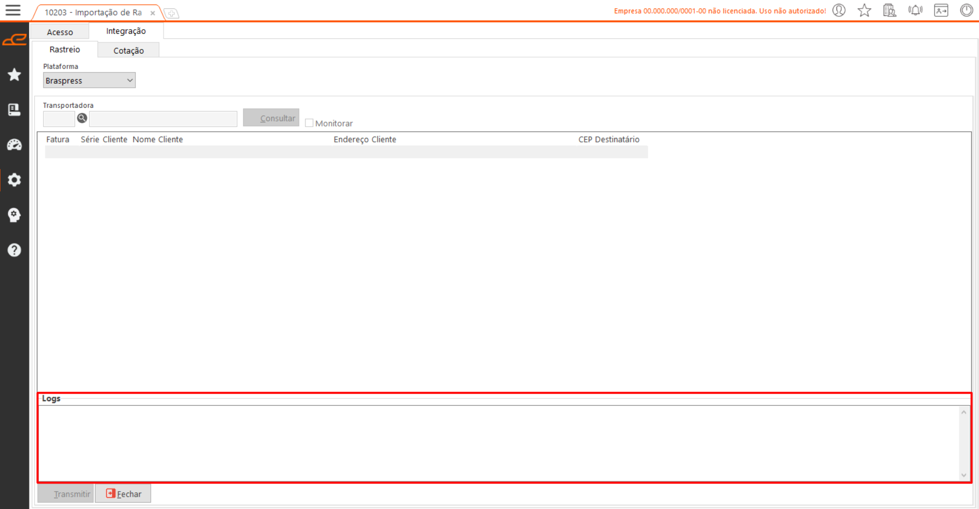 - Monitorar: Quando ativado, inicia o processo de monitoramento. O sistema gera um JSON com o CEP do destinatário e envia ao endpoint configurado no TI.ini. Se a resposta da transportadora for positiva, são registradas no banco as informações de fatura, rota, filial e cadastro da transportadora Braspress, além da atualização do status de rastreamento da nota no ERP.