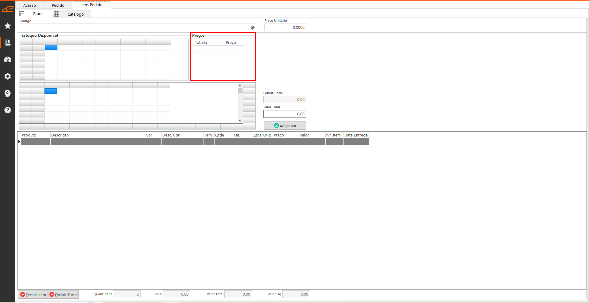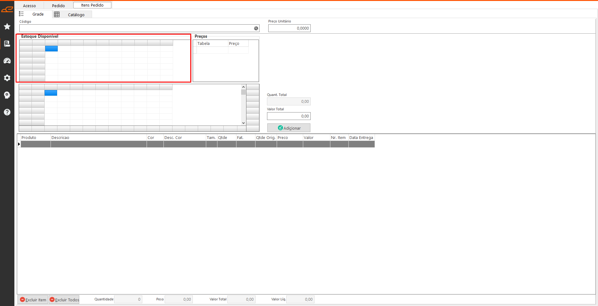 Exibe a grade de itens e estoque disponível.