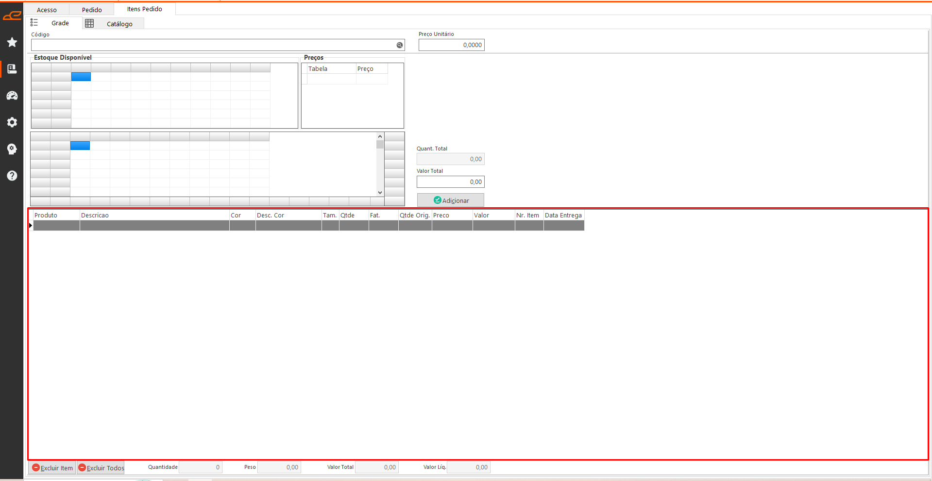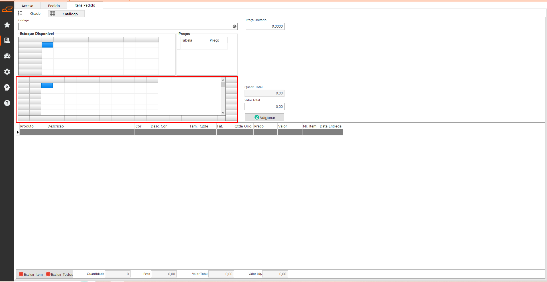 Aba destina a digitação de todos os itens do pedido, inclusão por cor e tamanho.