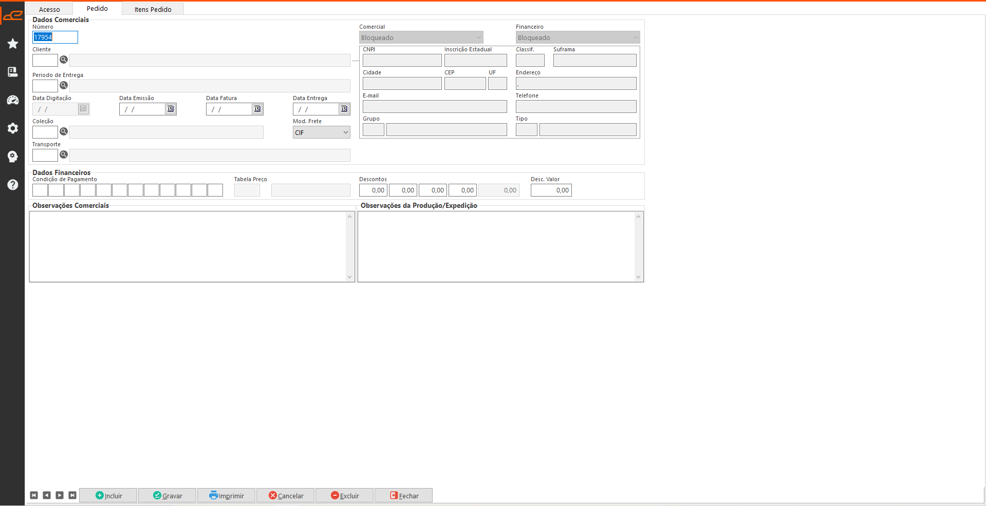 - Observações Comerciais: Campo para incluir observações relacionada a negociação do pedido.
