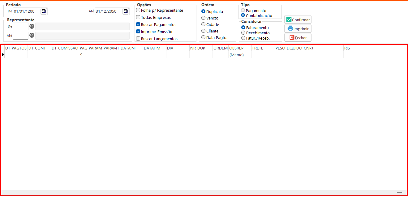 • Considerar: Define se a comissão consultada será baseada no faturamento ou no recebimento.