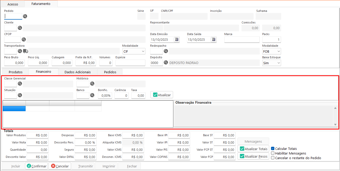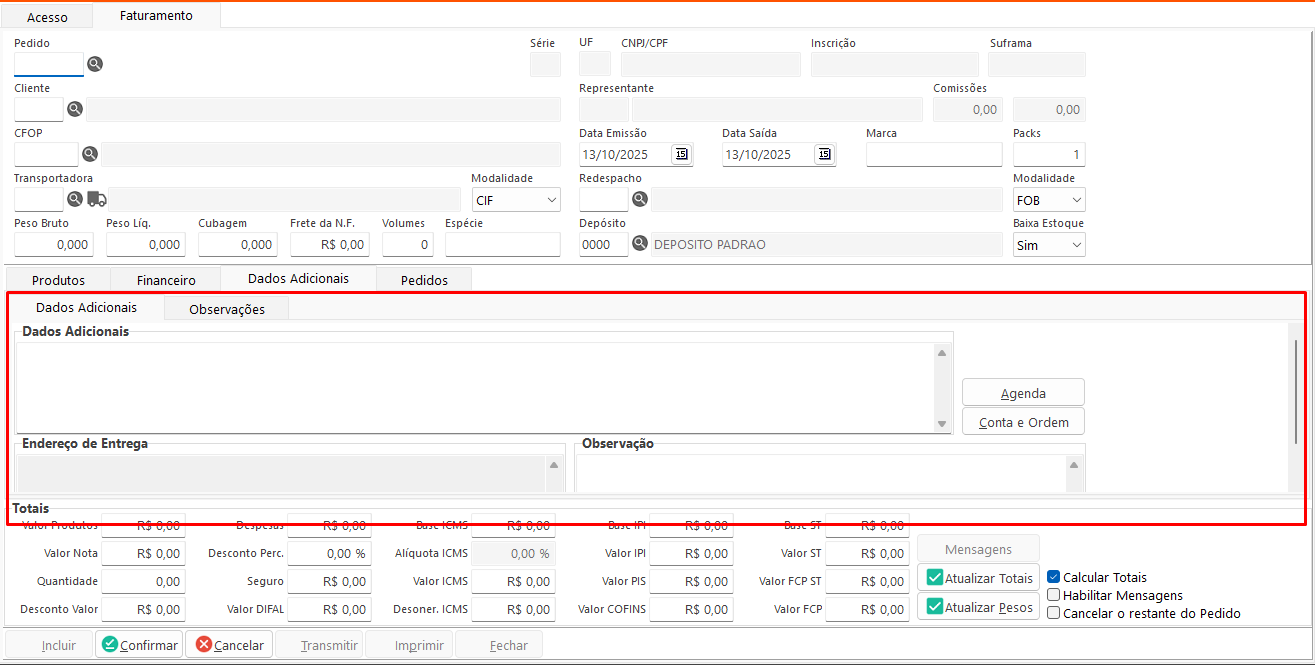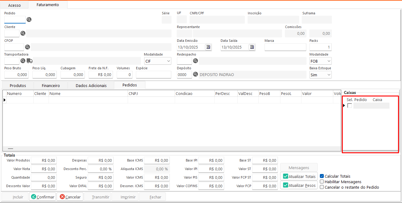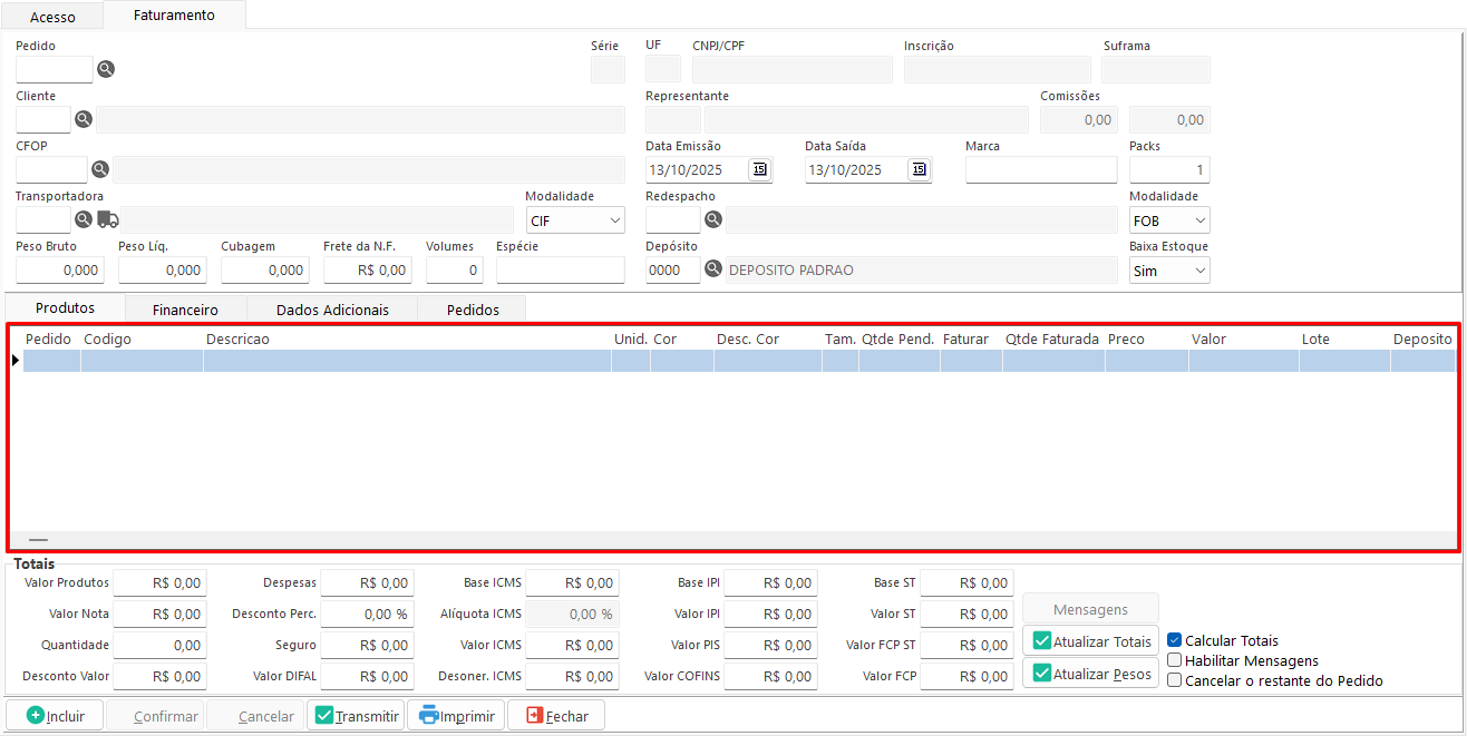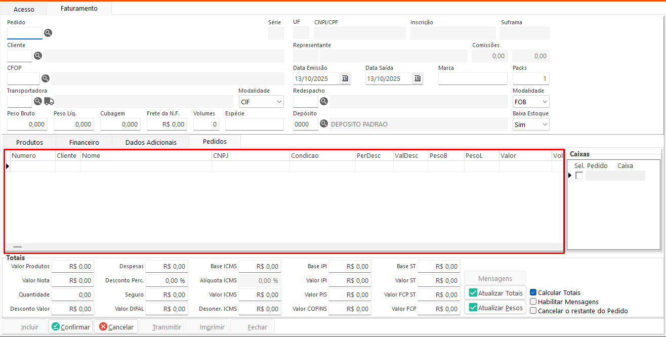 - Pedidos: Exibe todos os itens dos pedidos que estão sendo faturados em uma mesma nota fiscal.