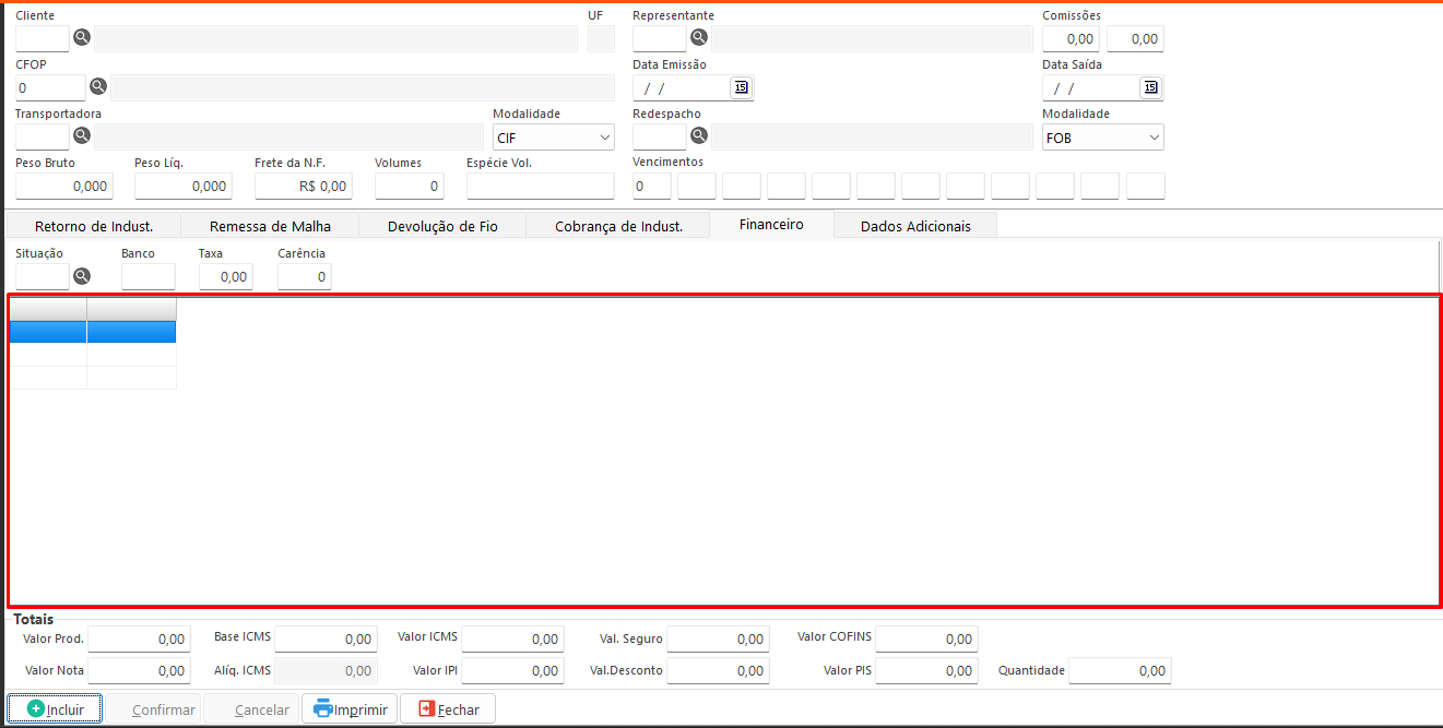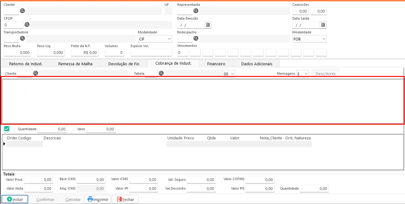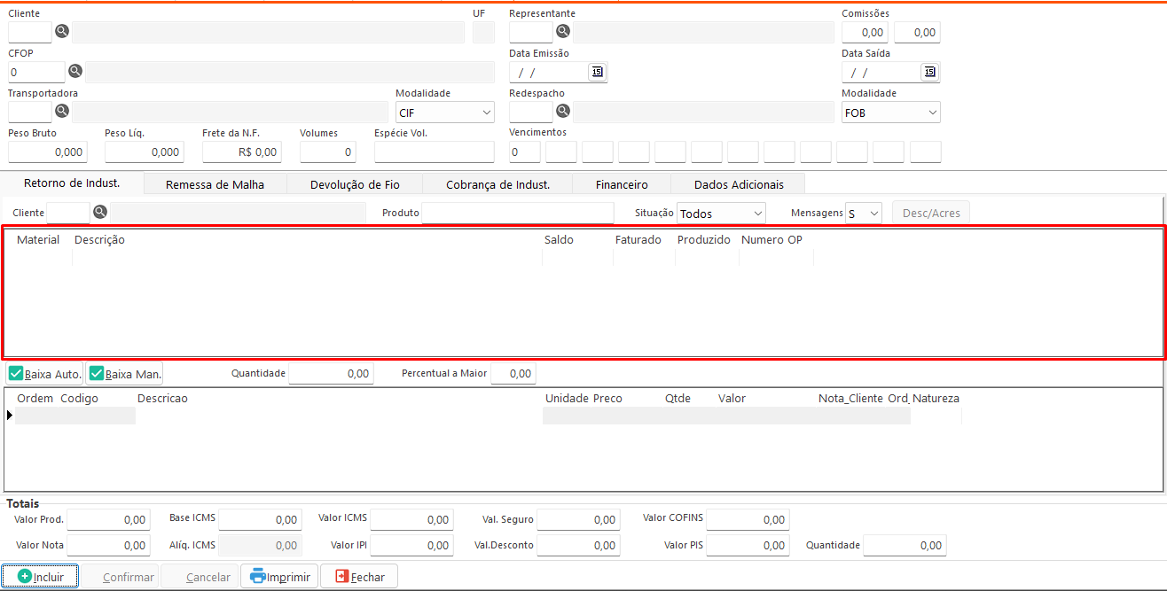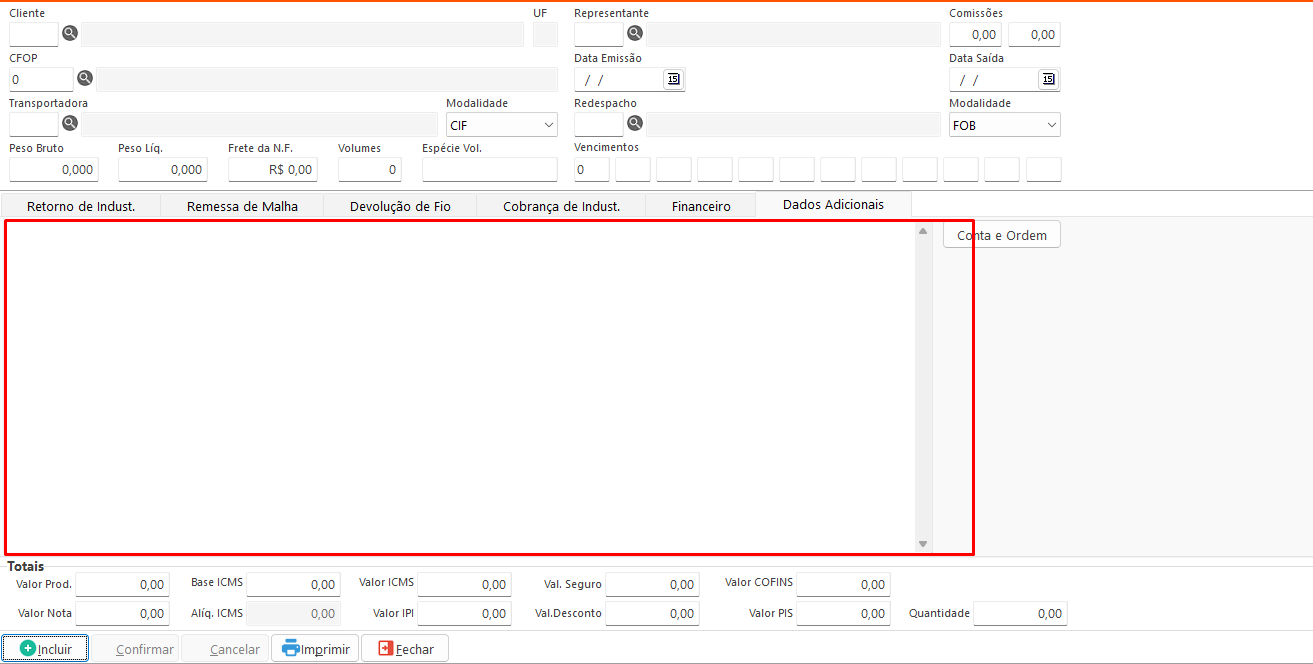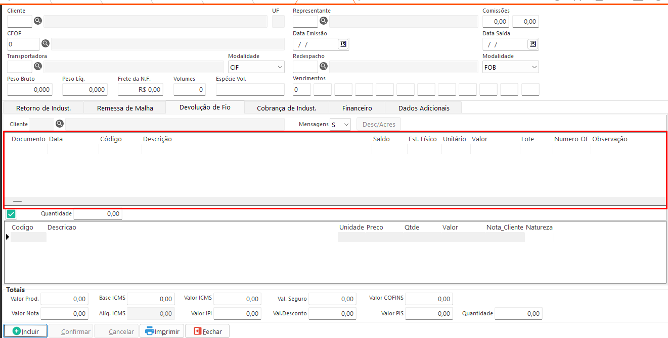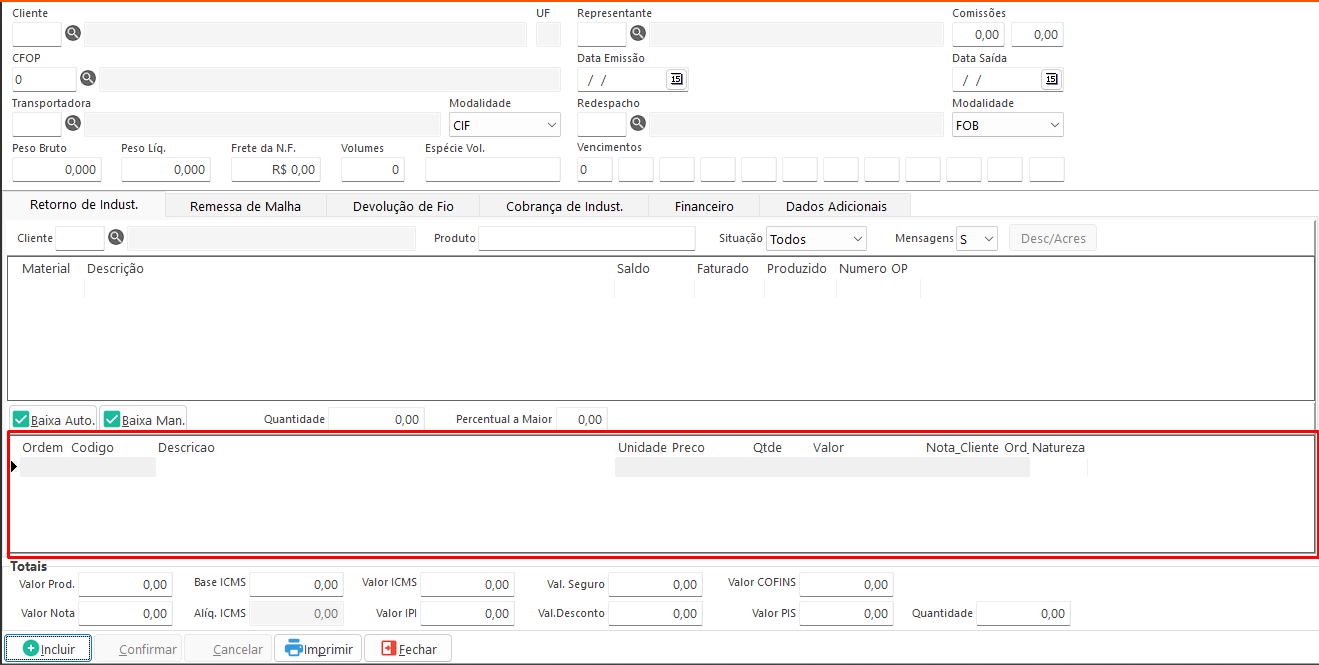 Adicionar: Adiciona o item selecionado à tabela de itens da nota para faturamento. Disponível nas abas Remessa de Malha, Devolução de Fio e Cobrança de Indústria.- Incluir: Habilita os campos para preenchimento.