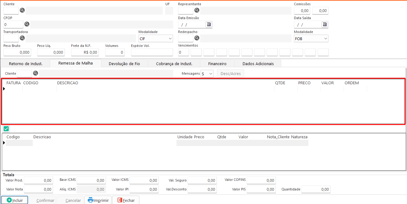 - Remessa de Malha: Exibe os itens das notas fiscais para faturamento de remessa.