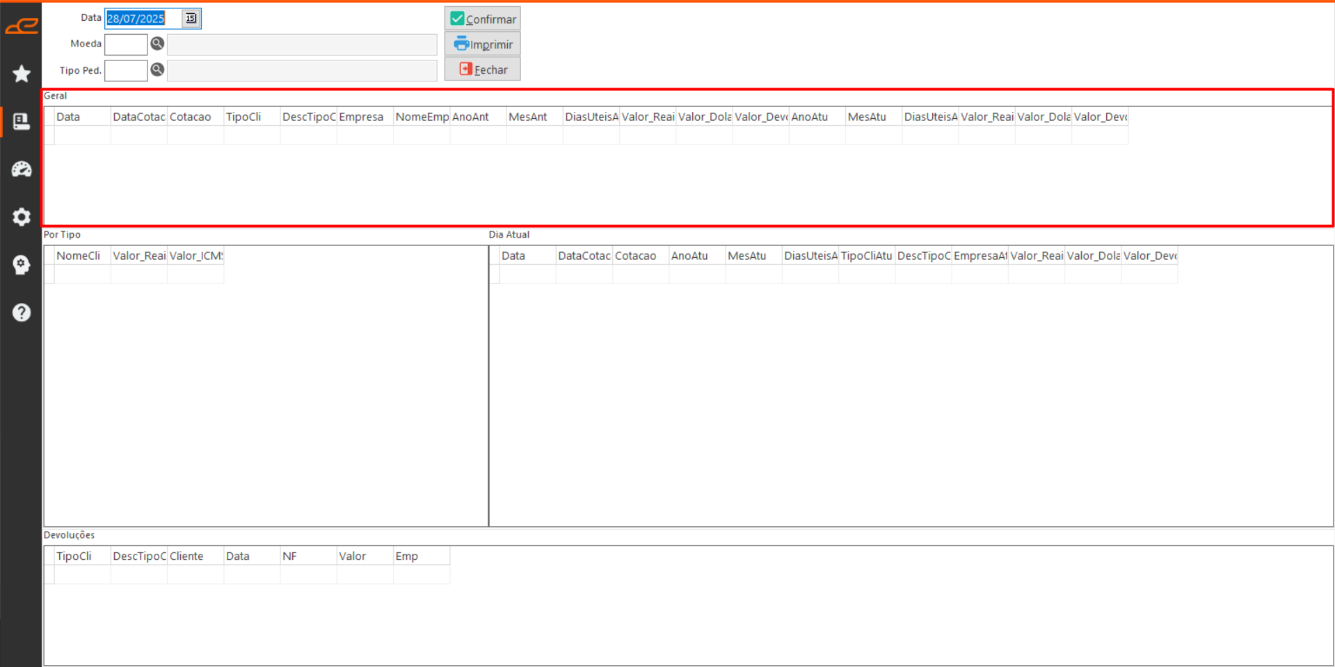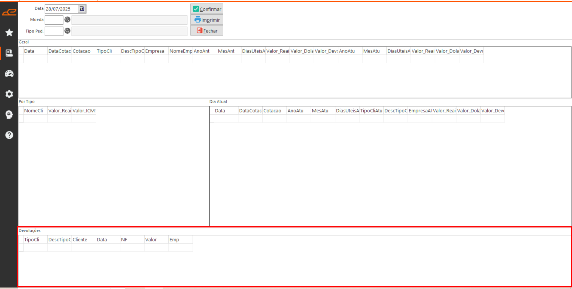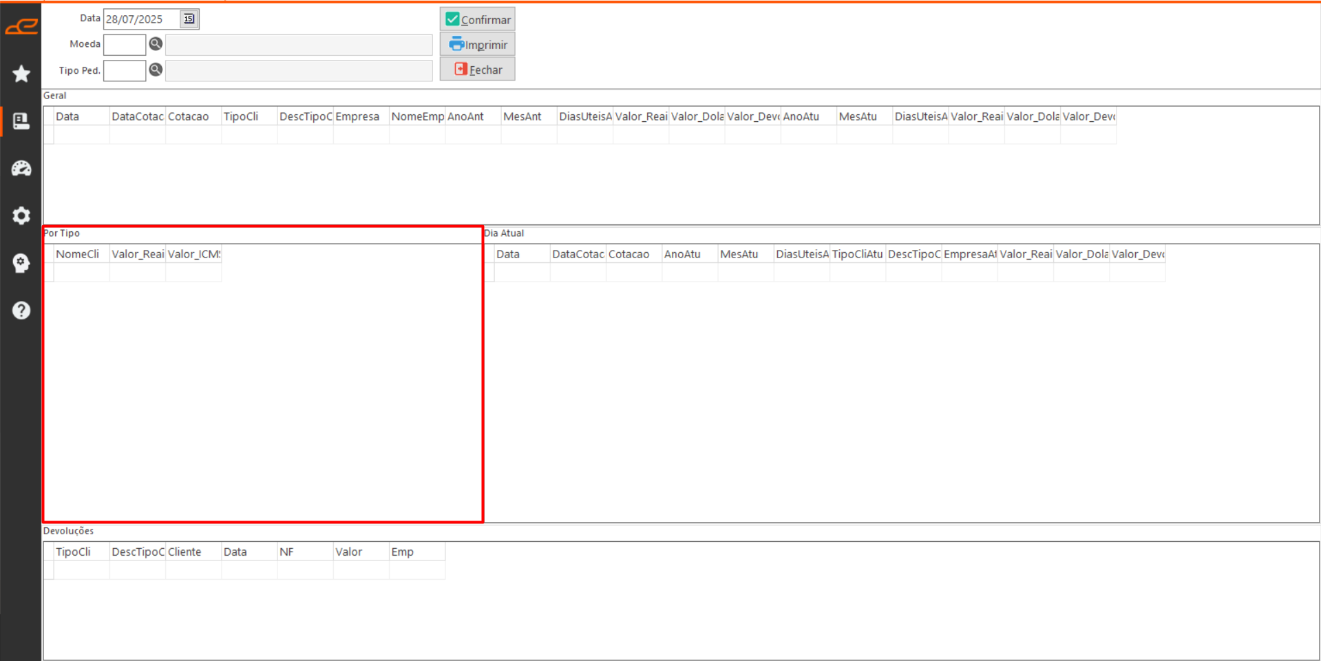 - Devoluções: Essa tabela exibe um relatório por empresa, mês, ano e tipo de cliente, com os valores recebidos e valores de devolução de notas fiscais emitidas na Data informada no filtro Data.