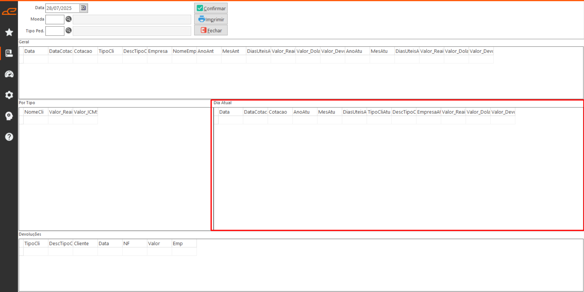 - Dia Atual: Essa tabela exibe valores de devoluções de notas fiscais emitidas ou recebidas, separadas por empresa, cliente, data e situação do cliente, referentes ao mês definido no filtro Data.