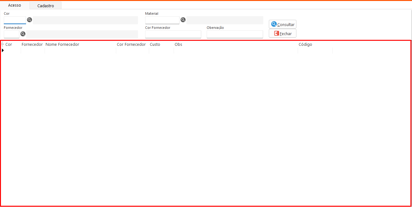 - Cor: Define na consulta o código da cor cadastrada para o material.
