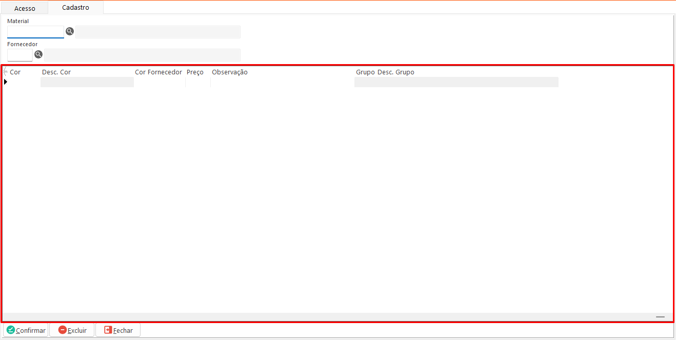 - Material: Apresenta o código da cor cadastrada no sistema, o código correspondente no sistema do fornecedor e o preço associado a essa cor.