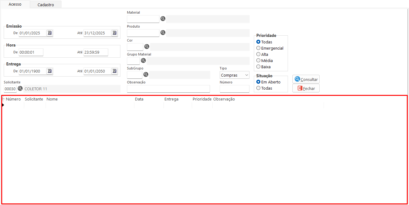 - Tipo: Informa o tipo da solicitação na consulta. Pode ser de Compras, Estoque, Serviço, Produção ou Orçamento.