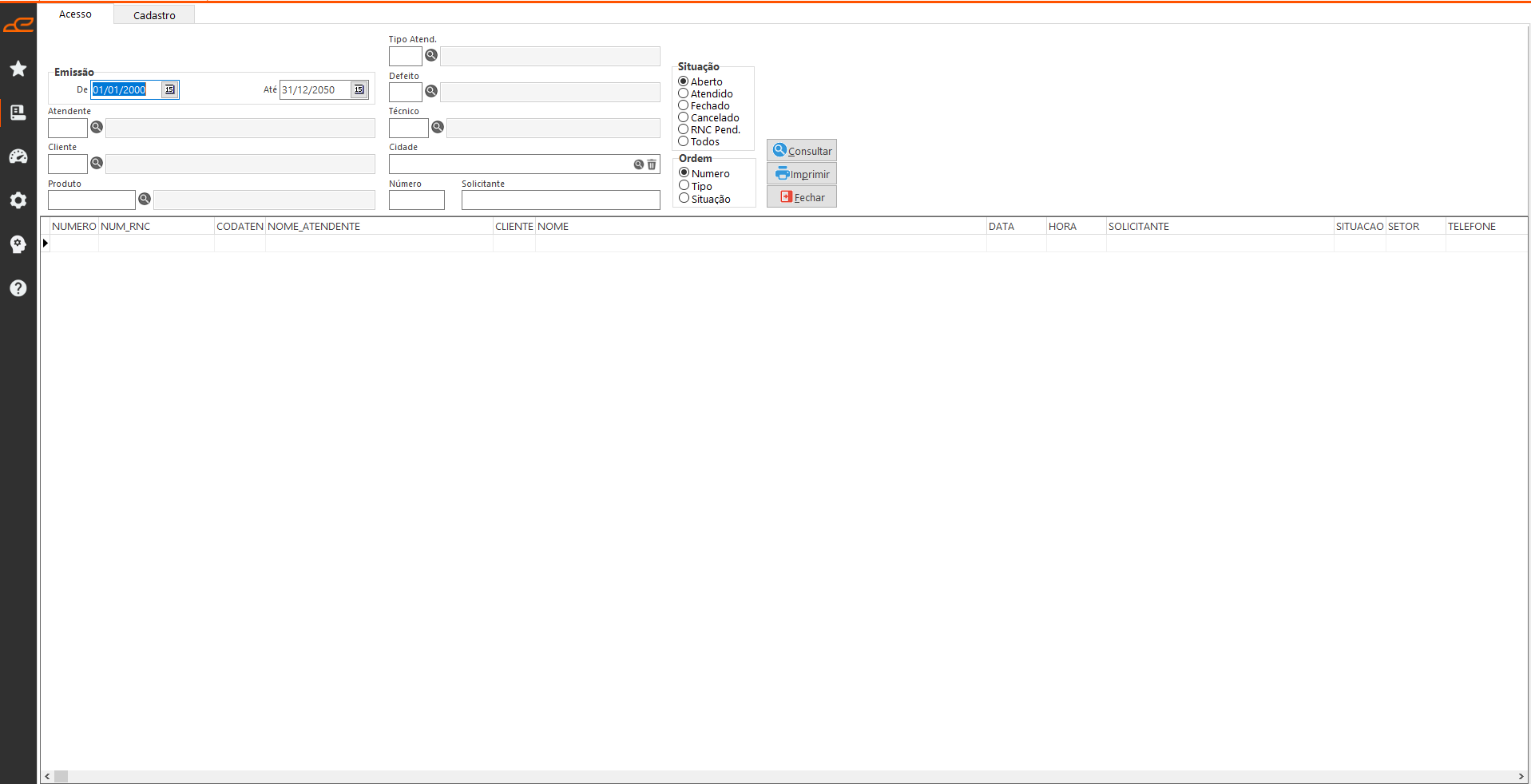 - Situação: Define a situação da Ordem de chamado técnico para consulta.