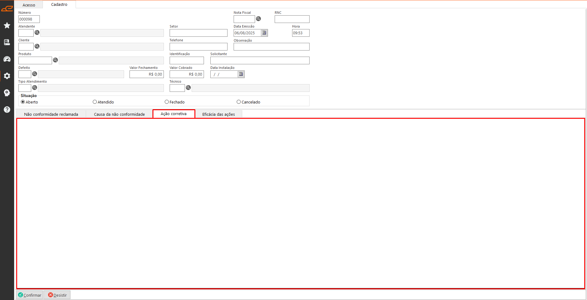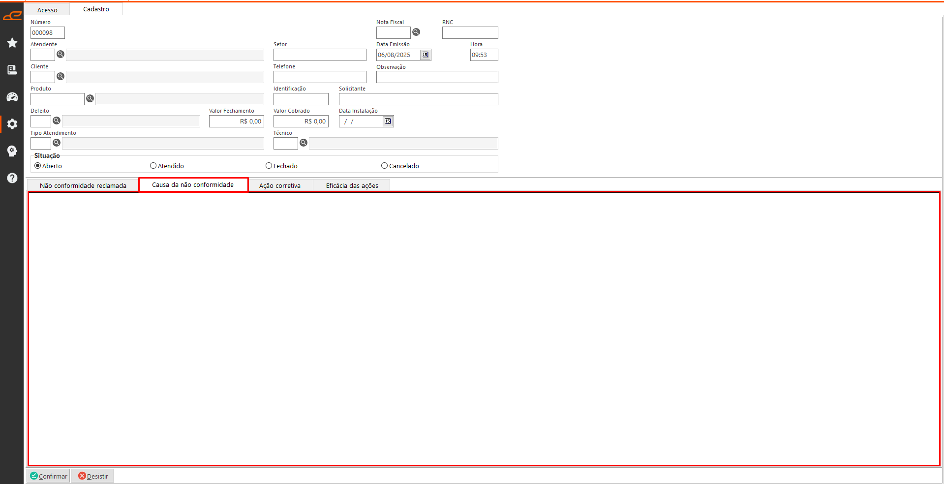 - Situação: Define a situação do cadastro da Ordem de chamado técnico.