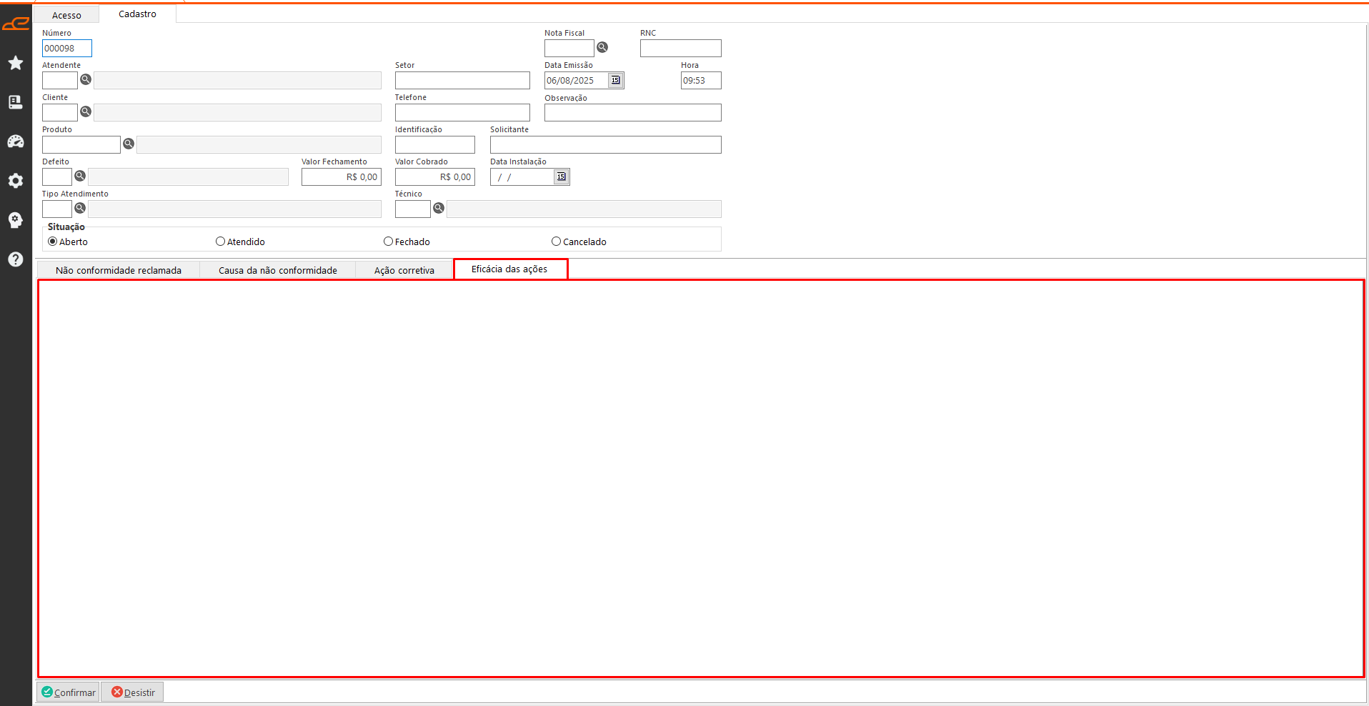 - Eficácia das ações: Permitir registrar a efetividade das correções aplicadas para solucionar a justificativa da abertura da ordem de chamado técnico.