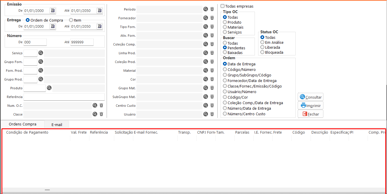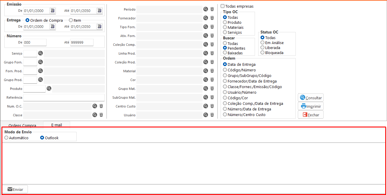 - Status da O.C.: Define, na consulta, o status da ordem de compra.