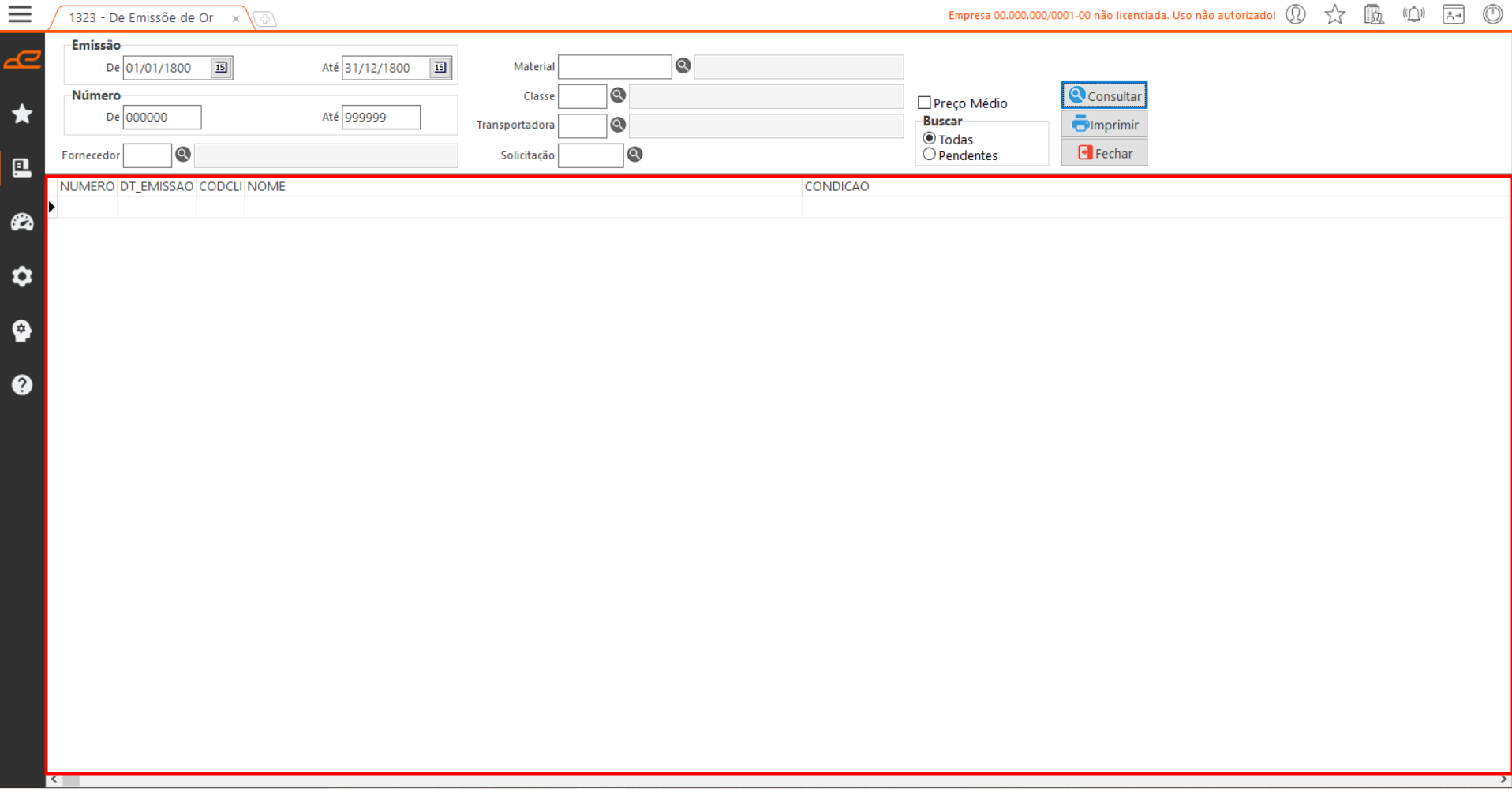 - Emissão: Filtro de datas no formato ‘De’ e ‘Até’ para a data da emissão da ordem de compra.