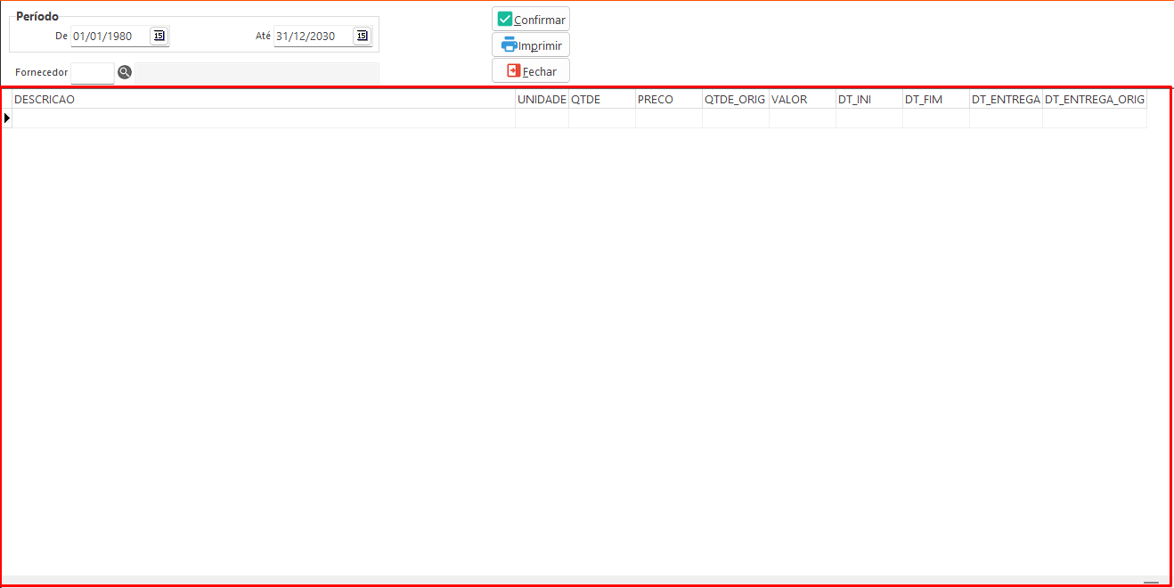 - Fornecedor: Define na consulta pelo código do fornecedor vinculado à ordem de compra.