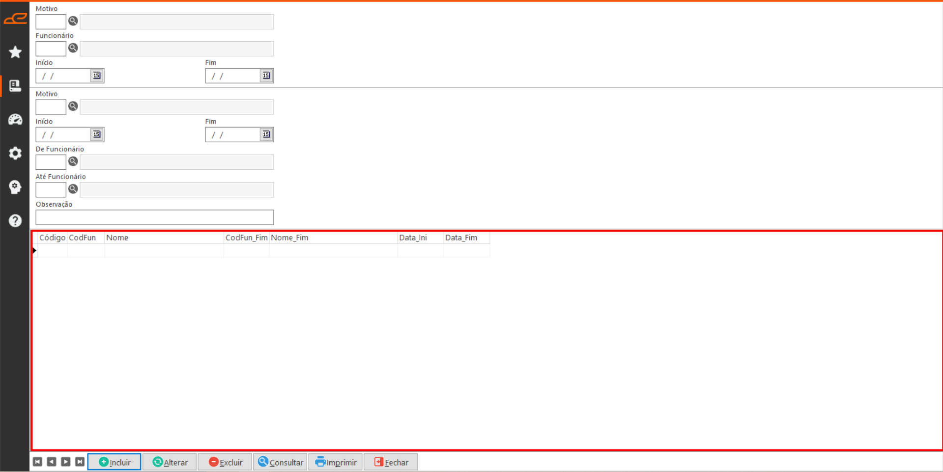 - Fim: Esse filtro é destinado ao cadastro do registro de faltas do funcionário. Permite informar a data final da falta.