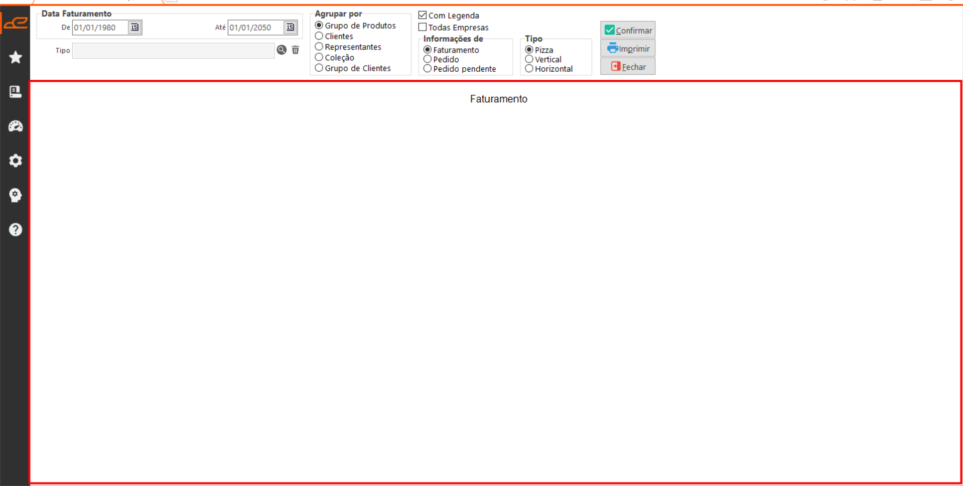 A tela “De Faturamento p/ Grupo” permite consultar dados relacionados ao faturamento e exibe os resultados em formato de gráficos, cujo tipo pode ser selecionado pelo usuário.