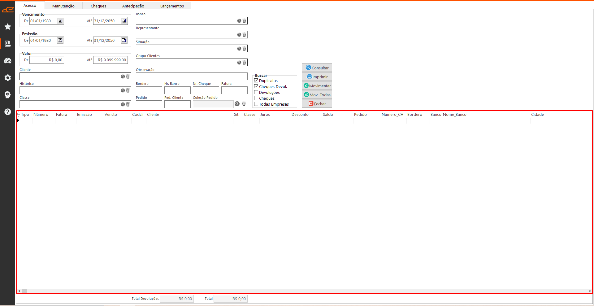- Cheques Devol.: permite consultar os cheques de terceiros com status devolvido no receber.