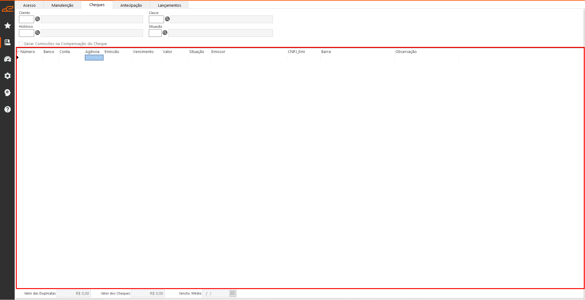 - Vencto. Médio: Campo informativo que apresenta a data média de vencimento, calculada à partir das datas de vencimento informadas nos cheques, utilizada para o pagamento de comissões, quando não utilizado o parâmetro para gerar comissão na compensação do cheque.