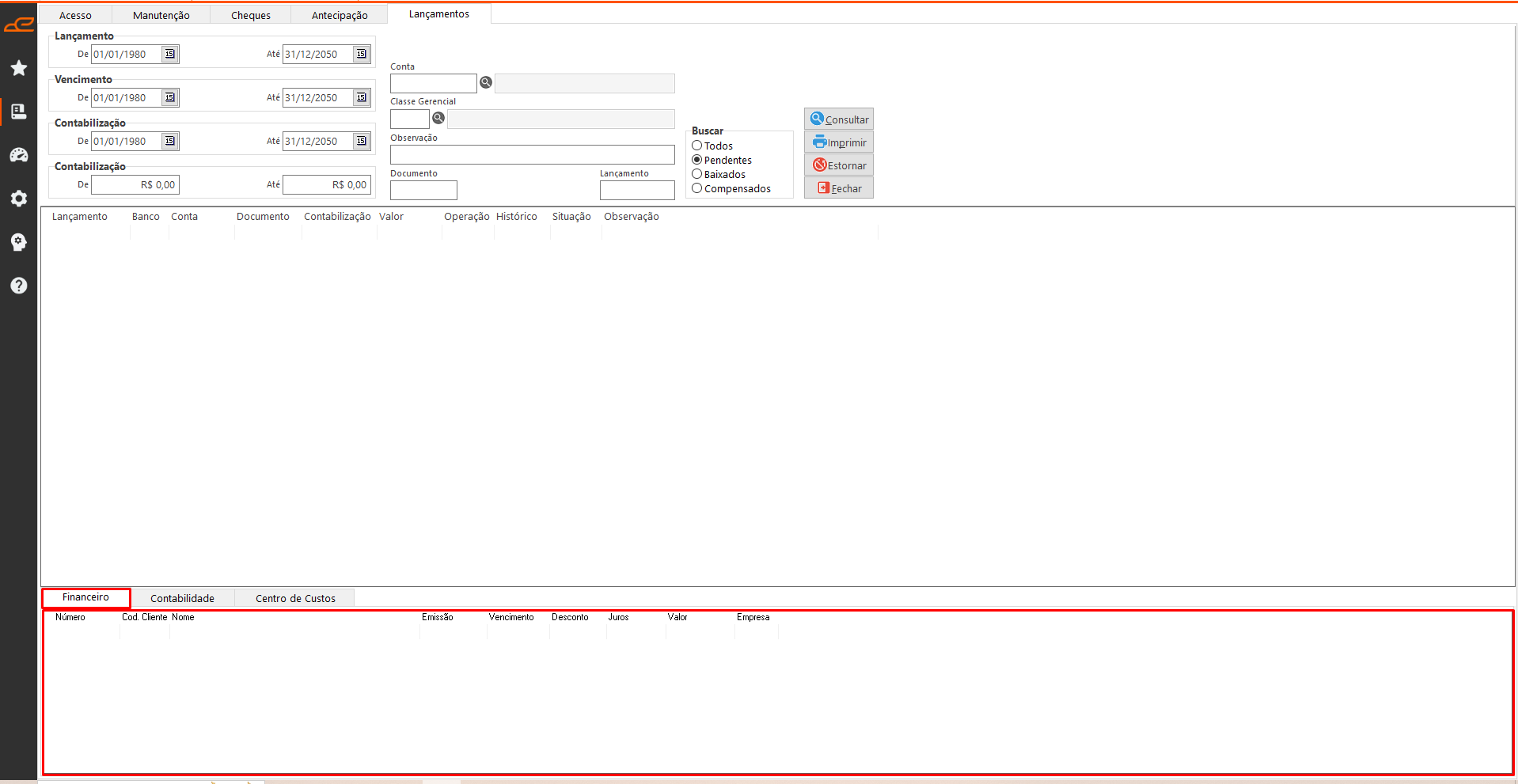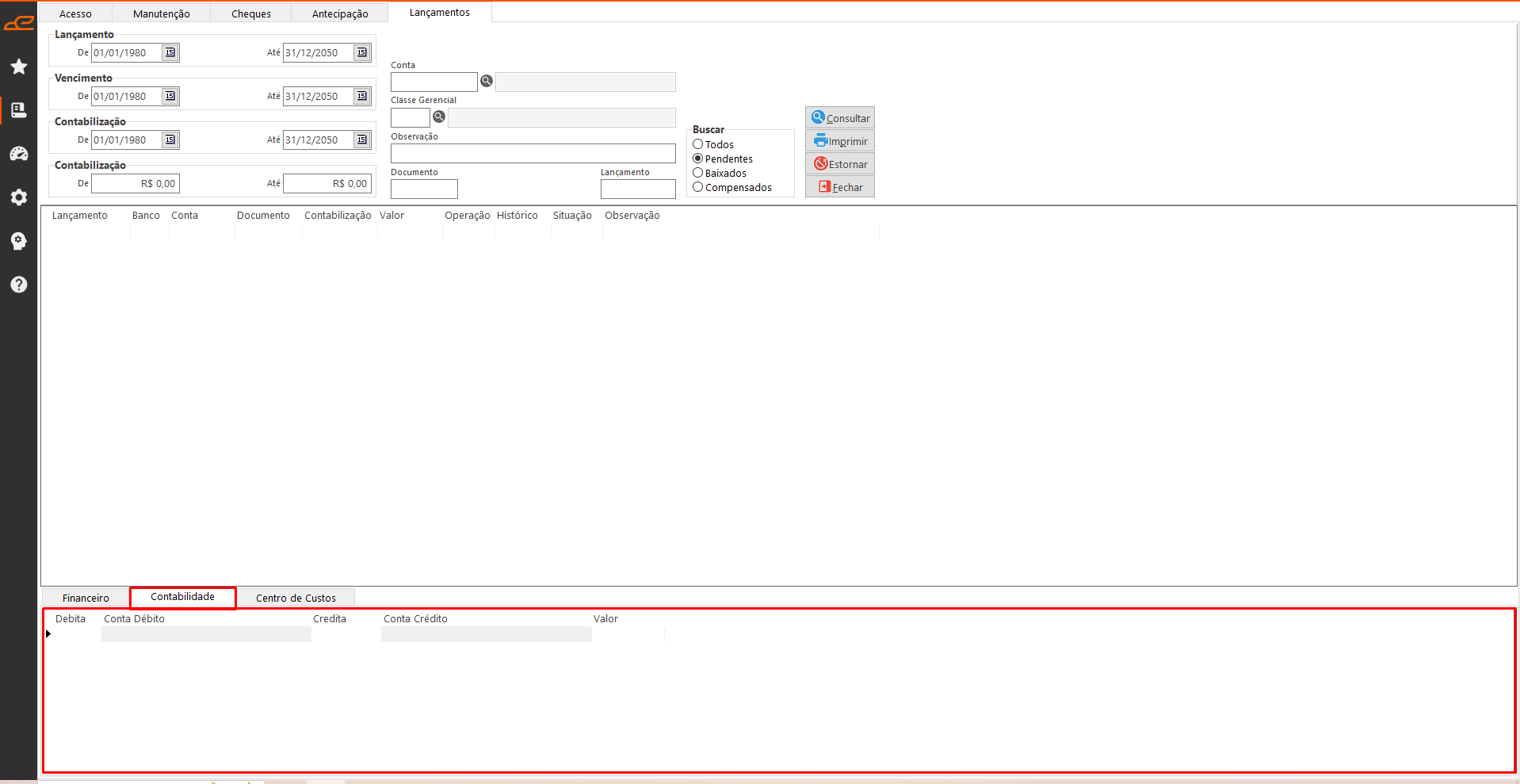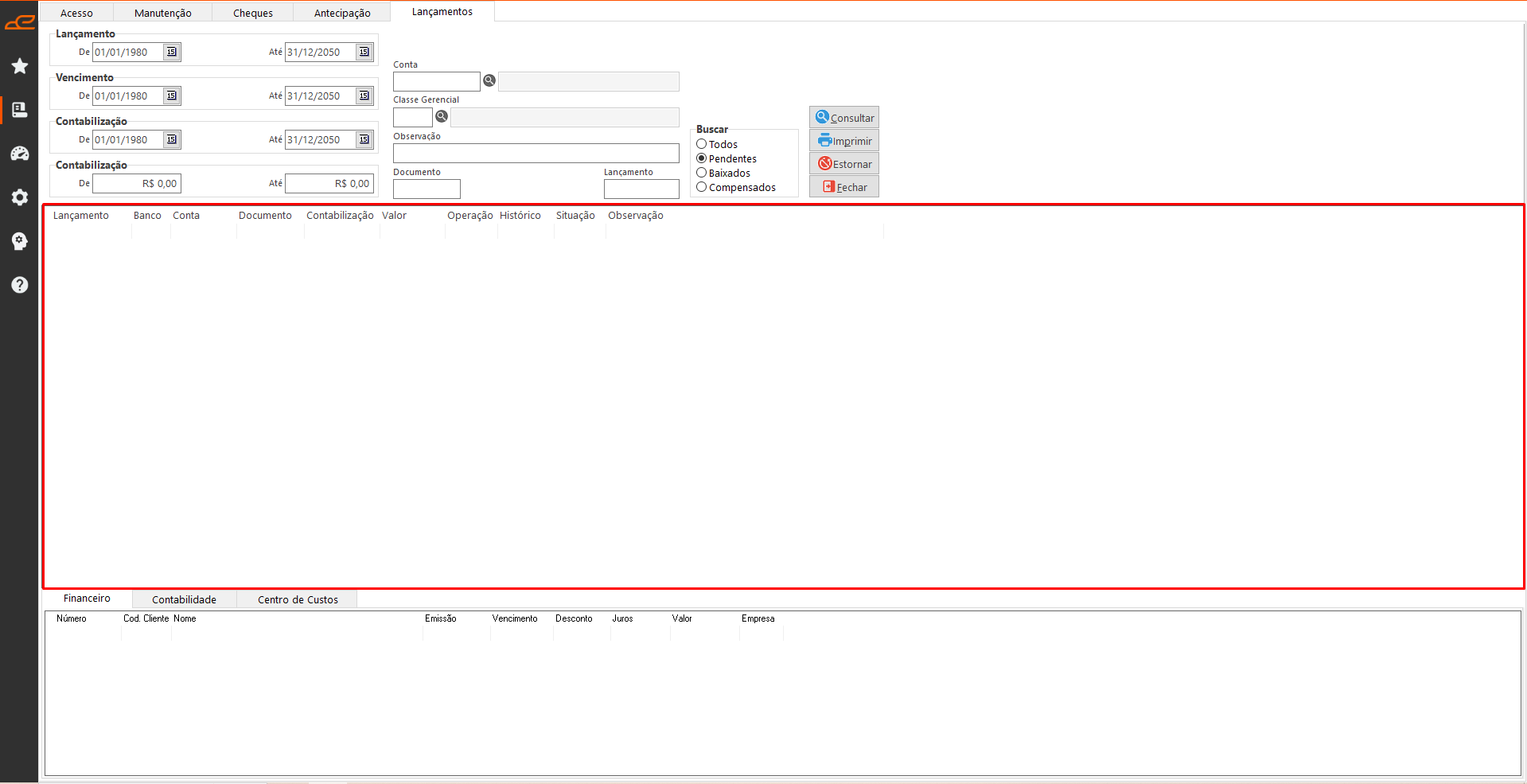 - Consultar: Apresenta os lançamentos conforme os filtros selecionados.