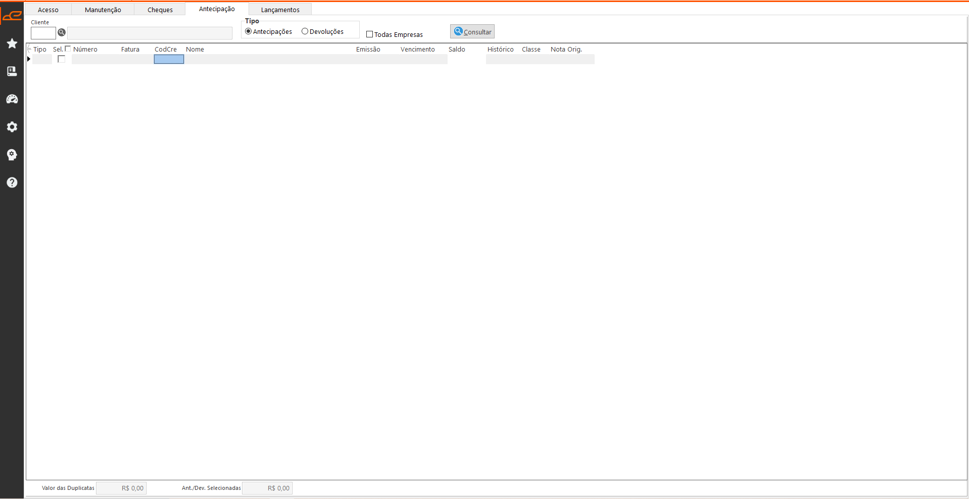 - Ant./Dev. Selecionadas: Campo informativo que apresenta a soma das antecipações ou devoluções selecionadas para abater nas duplicatas listadas em tela.