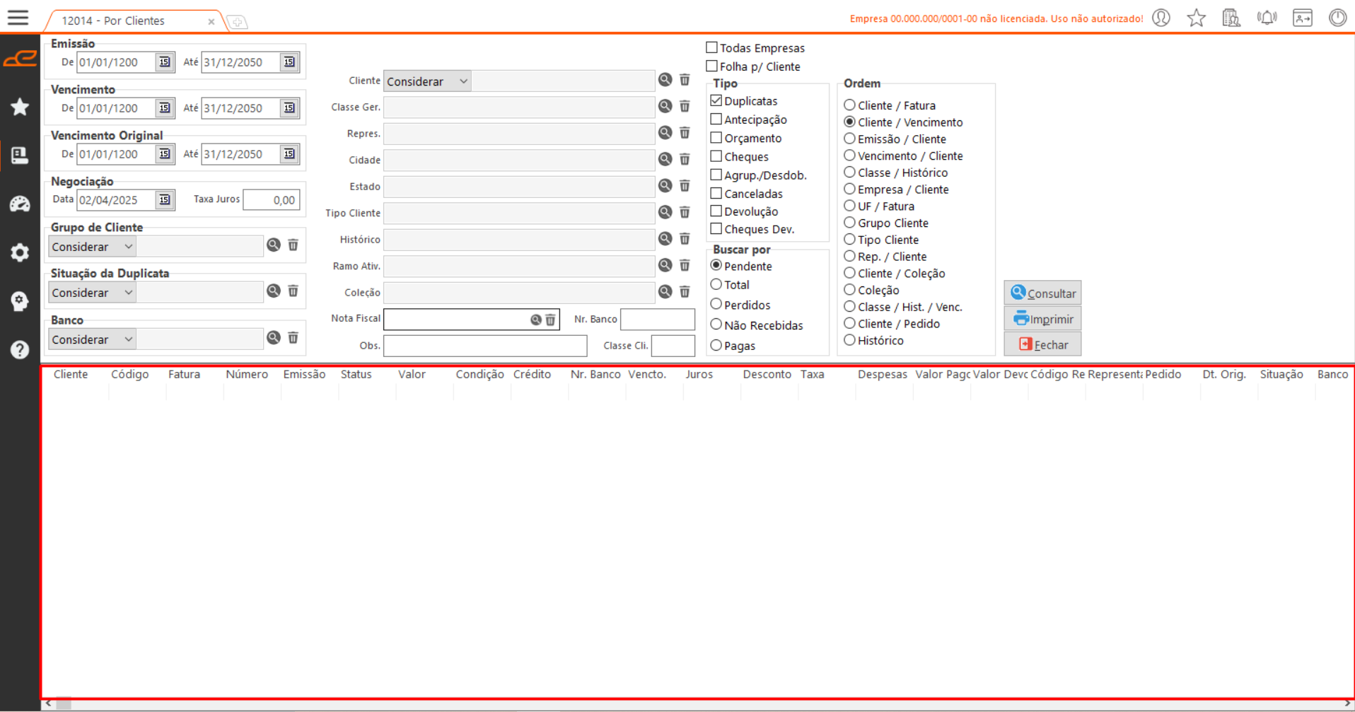 - Cliente: Considera ou desconsidera clientes da duplicata na consulta.