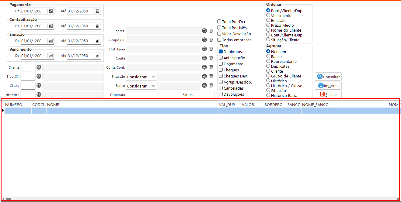 • Duplicatas: Inclui registros do tipo duplicata na consulta.