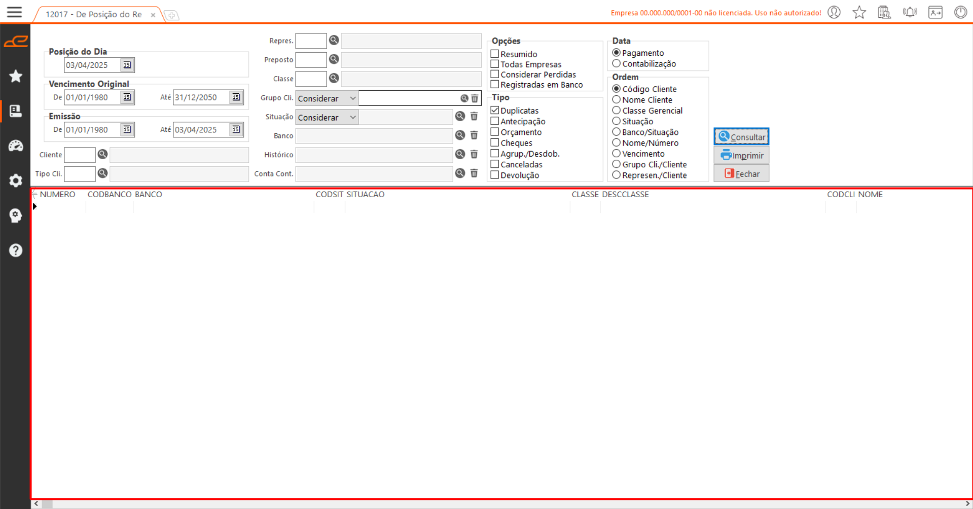 - Posição do Dia: Filtro de data utilizado para buscar duplicatas com datas de vencimento menores ou iguais à data especificada e cujo pagamento ocorra em uma data maior ou igual à data informada.