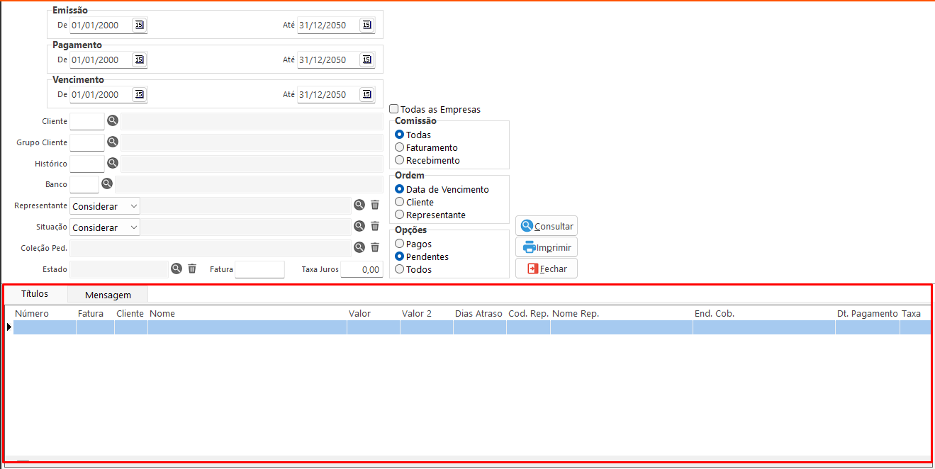 • Comissão: Filtra os registros com base na comissão vinculada à duplicata.