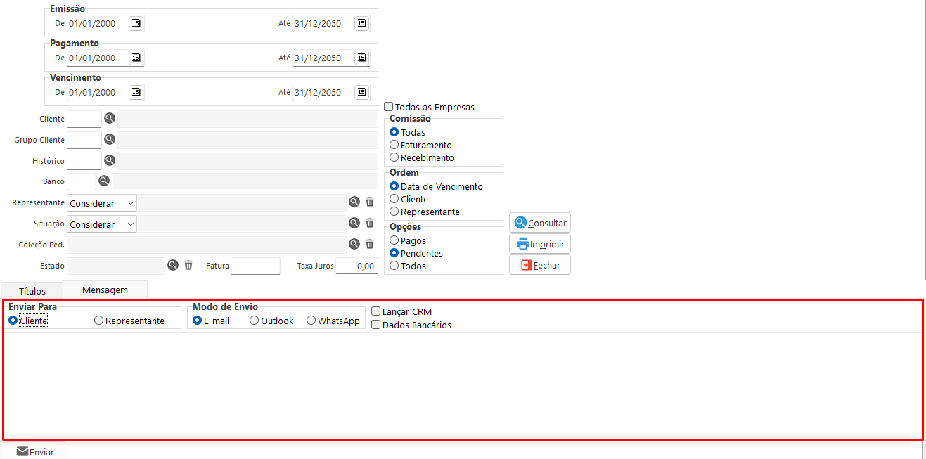 • Enviar Para: Define o destinatário do envio, podendo ser o cliente ou o representante vinculado à duplicata.