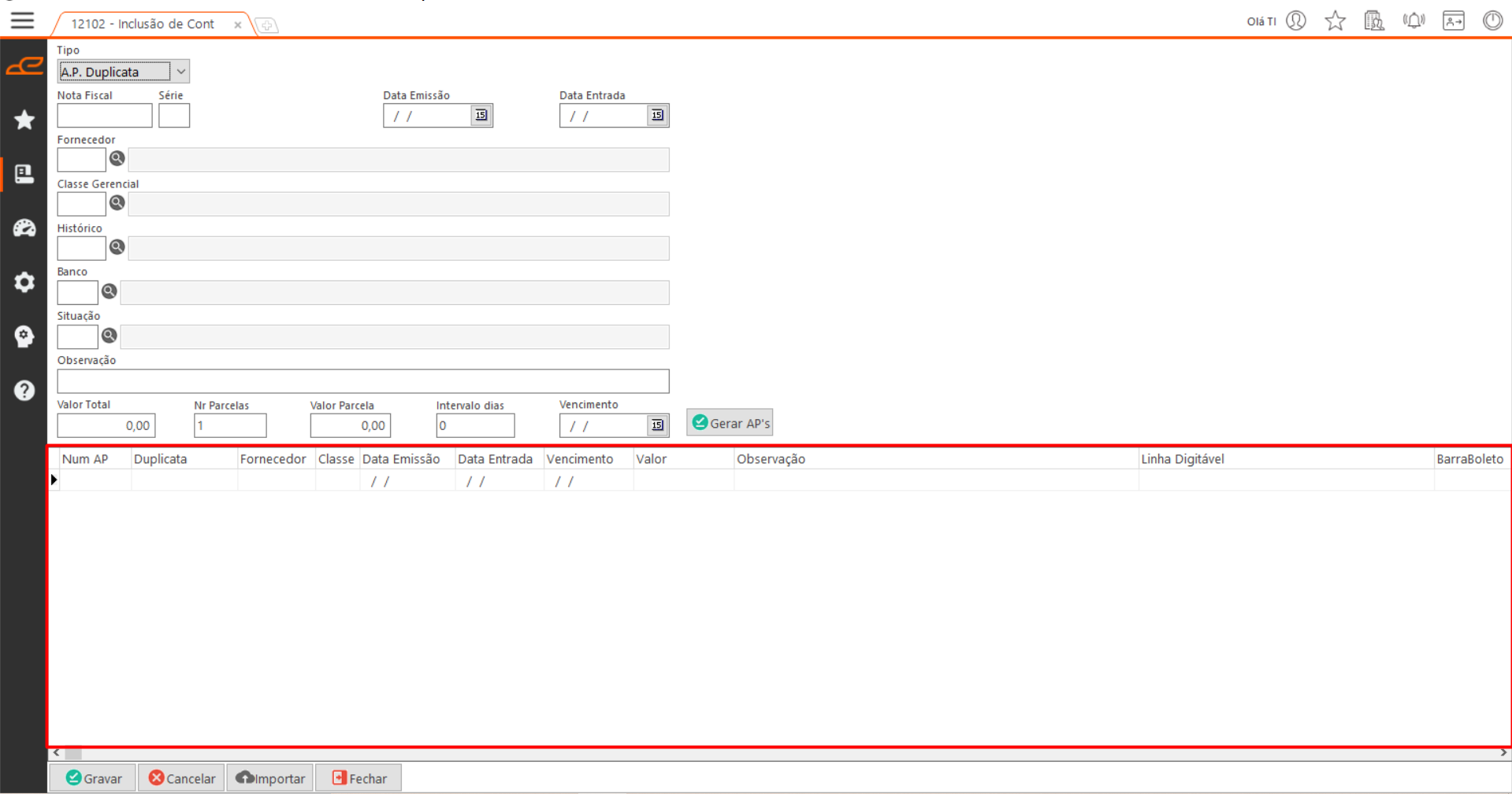 - Gerar AP’s: Cria as APs de acordo com a quantidade de parcelas especificada pelo usuário.