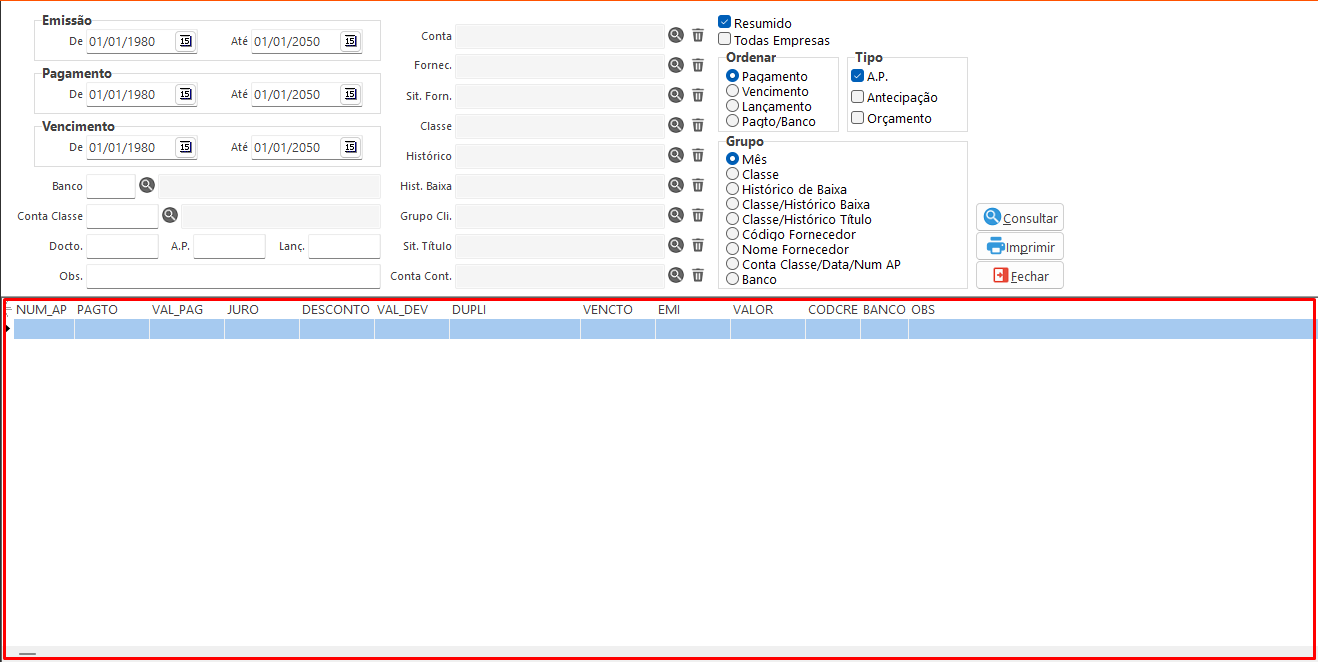- Tipo: permite buscar os documentos do tipo AP Duplicatas, Antecipação e/ou Orçamento.