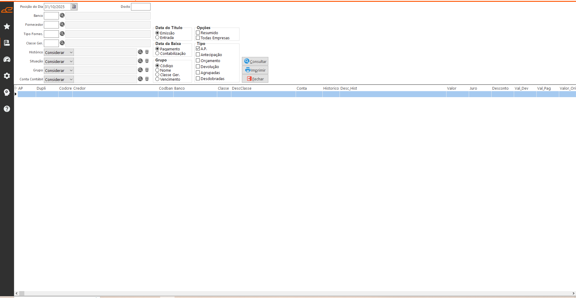 - Posição do Dia: Permite informar a data que se deseja analisar as duplicatas a pagar.