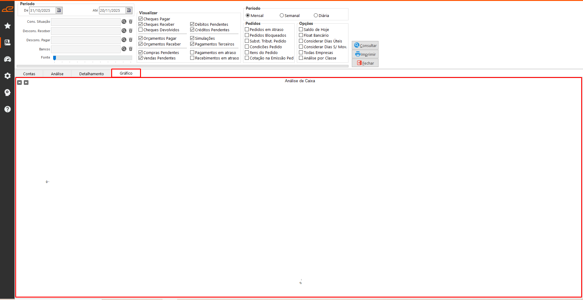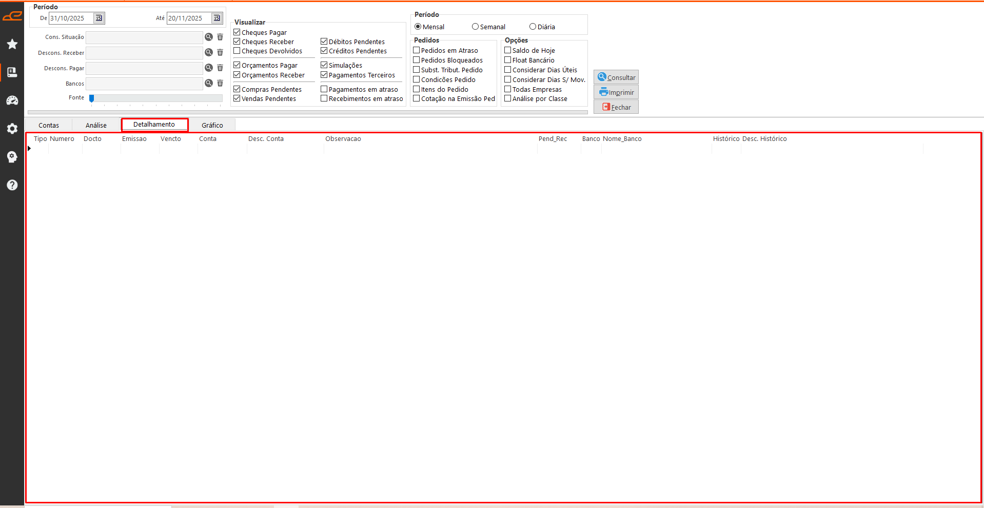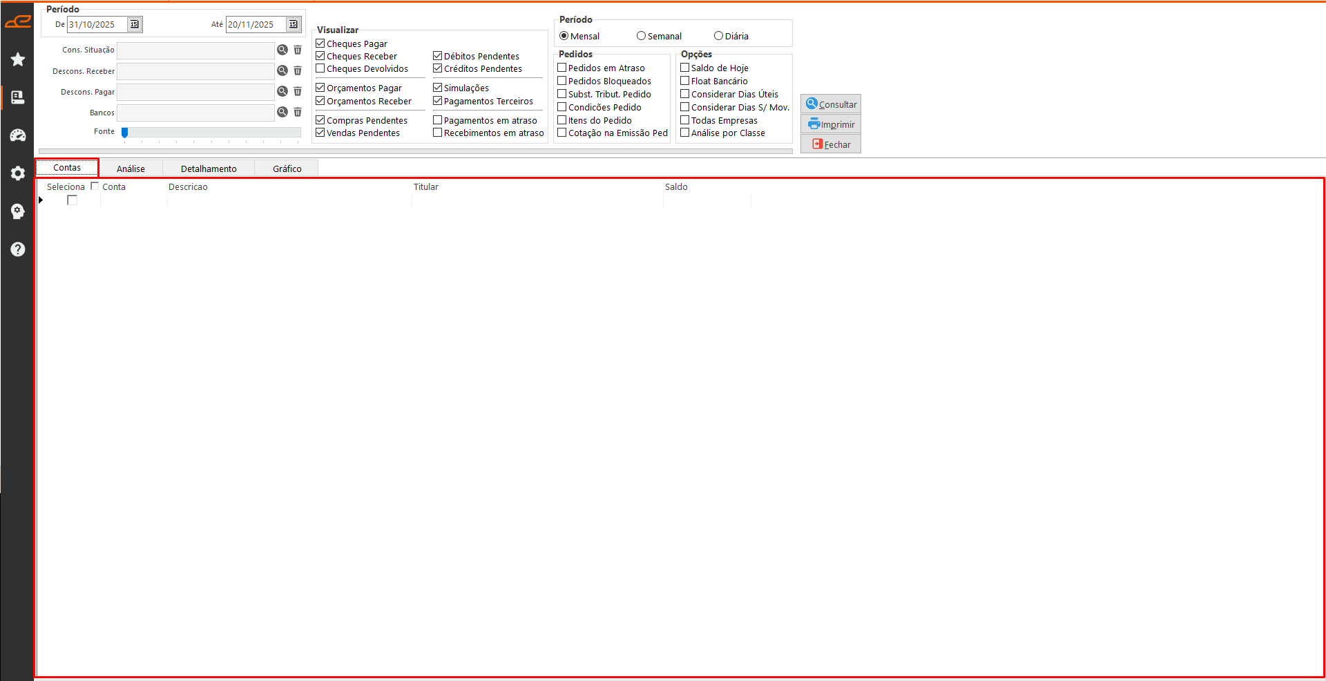 - Período: Permite definir o intervalo de datas utilizado na consulta da análise de fluxo de caixa.